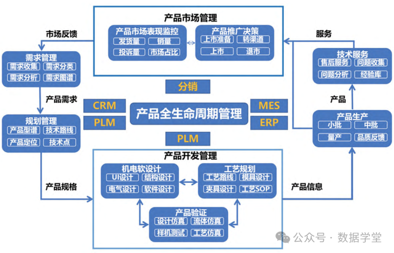 了解顾客对产品和服务的不同需求、期望和偏好;建立市场管理流程、需求管理流程,通过智能化产品终端用户使用的数据、客户调研,及时对客户需求快速转换,以PLM系统及物联网、大数据、人工智能等技术应用,促进智能化新产品的研发迭代,打通企业产品需求分析、规划、设计、生产、经销、运行、使用、维修保养直到回收再用处置的全生命周期中的相关系统和企业内外部的信息息流,串联企业、供应商、经销商、客户等相关主体,实现产品全生命周期服务延伸(见图3)。