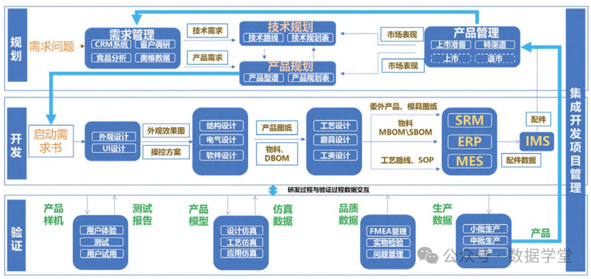 公司以产品为中心的研发全生命周期管理,建立“以需求为导向”的数字化研发模式,依托多学科仿真工具、协同设计管理平台PLM、测试管理平台LIMS、工艺设计平台CAPP,对产品研发过程中仿真分析、模型设计、BOM设计、工艺设计等过程进行在线化、数据化,实现从规划、开发、测试、验证管理全流程在线,使研发过程更加高效协同,研发数据安全共享,通过对接ERP、MES、IMS,实现设计、生产、营销服务等环节数据的贯通(见图2)。