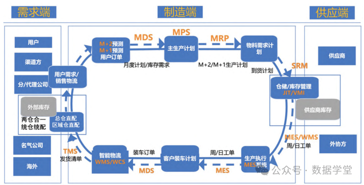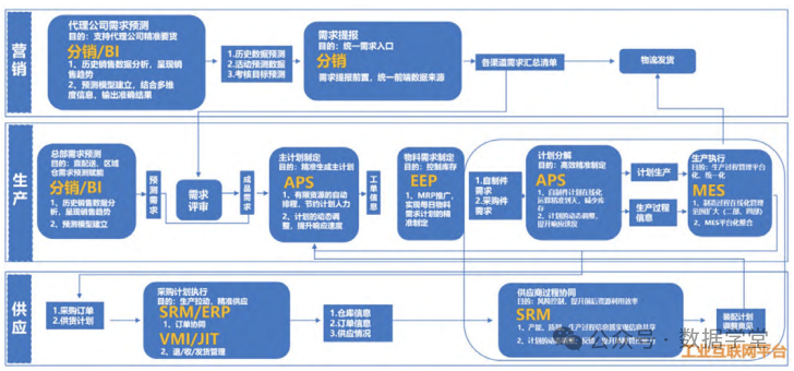 通过ERP、MES、MRP、WMS等系统建设、打通了需求端、制造端、供应端计划信息全链条。1、需求端:结合MRP系统及SRM系统分析需求与库存匹配,分解出主生产计划,实现了用户需求与生产计划的精准协同。2、制造端:集成应用WMS、ERP、MES等信息化系统,打通计划信息流,通过MES系统生产计划看板、库存看板及信息看板,对车间生产的计划进度及情况进行智能化实时监控。3、供应端:采用JIT/VMI,与供应商的库存、计划及时共享,减少供应链的牛鞭效应,供应链各节点库存得到有效控制。实现了外部用户需求与公司内部生产计划的精准协同、公司内部生产计划与内部人员、物料库存、设备、制造工艺过程等要素信息全流程融合贯通、内部物料库存与供应商的库存、计划及时共享。(见图6)