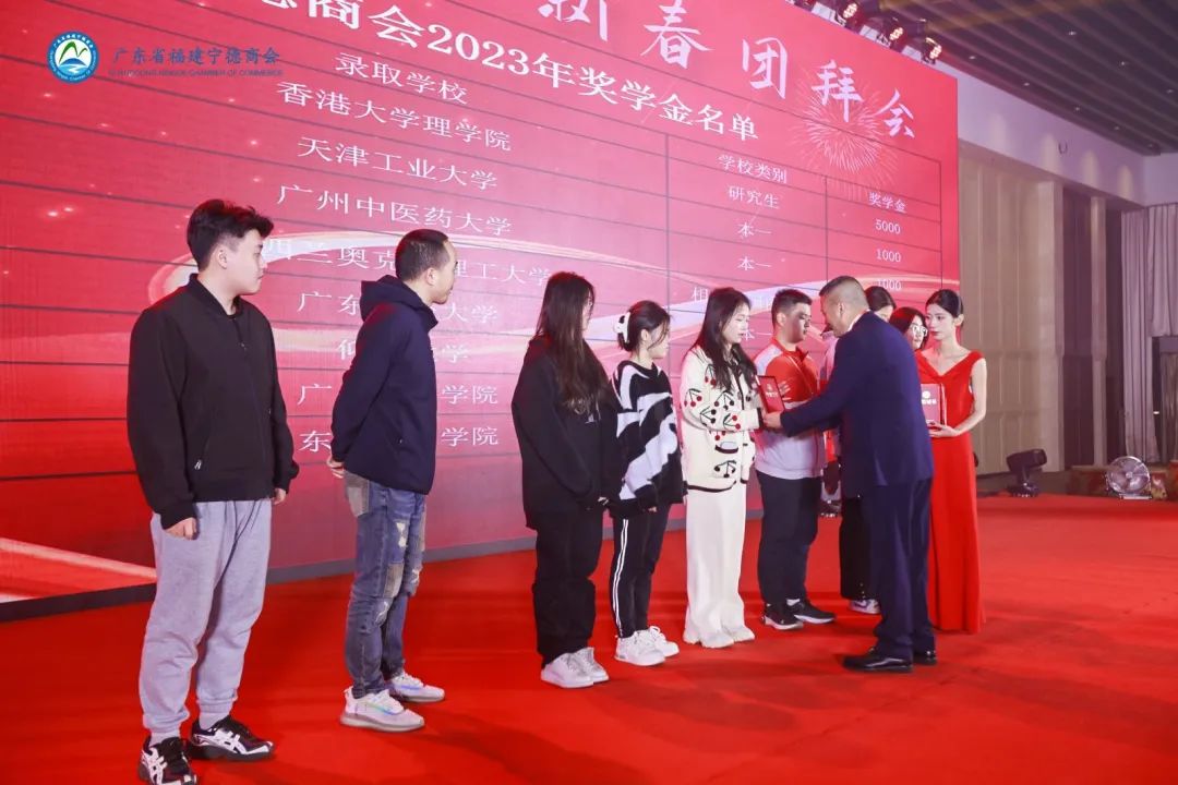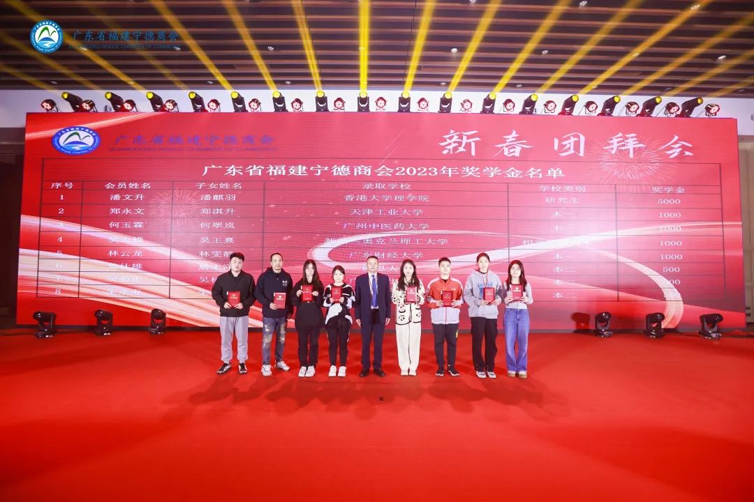 丁司令为获得“荣誉功勋奖”的创会会长陈荣华,荣誉会长陈日铃、黄寿强,名誉会长黄聿新、王登乐、方瑞喜、周庆贺、徐健家颁发荣誉证书。 荣誉会长陈荣华为获得“突出贡献奖”的陆卫平,陈小玲,陈世壁,陈贵明,陈弟二,肖运权,陈恒惠,陈锦发,张和贵,王纯宇,凌家强,韦光清,郑扬贵,杨宝廷,刘雪琴,谢尚招,陈 锋颁发荣誉证书。 荣誉会长陈日铃为获得“爱心企业奖”的许妙天,谢尚招,陆卫平,杨成武,温应旭,陈小玲,刘奕章,郑丽梅,张允俊,杨星星,吴锦华,杨 华,卓玉英,林裕坤,杨 涵,许妙钟,陈观忠,林 强,杨建雄,雷 云,沈鸿建,阮诗文,吴小清,游仁宇,郭锋漳颁发荣誉证书。 秘书长兼执行会长沈世林为获得“先进个人奖”的卢允同,叶晨潞,朱永寿,朱 艳,张嘉兮,蔡东霞,陈贵明,陈弟二,肖运权,陈恒惠,陈锦发,王纯宇,凌家强,陈世壁,刘奕章,阮诗文,周大春,陈长庚,陆雪冲,徐国斌,吴运鸿,何金全,王 辉,蒋月仙,刘丽春,许兴芝,吴雅琸,高少颜颁发荣誉证书。 为进一步弘扬优良传统,鼓励人才成长,营造读书成才、教育强国的良好氛围,广东省福建宁德商会为2023年考上本科大学、研究生、硕博连读、博士的我会会员子女以及人才交流中心子女发放奖学金。朱东炫会长亲切地为2023年升学的潘麒羽同学、郑淇升同学、何翠岚同学、吴王熹同学、林雯静同学、詹丰泽同学、吴杨欣同学、朱心怡同学颁发了荣誉证书和奖学金。 新春团拜会现场在缤纷绚丽的灯光下荡漾开祥和喜悦的气氛。商会执行会长以上领导纷纷登台,由朱东炫会长带领,共同合唱《桑梓情》。美好的歌声里饱含着浓浓乡情,牵动着每一位乡贤的心,会场内大家都情不自禁地跟唱,将乡情系在歌声里,回荡在宴会厅内。曲毕,大家都斟满酒杯,庆祝这美好的时刻。浓厚的乡情与喜悦尽在杯中,大家举杯共饮!