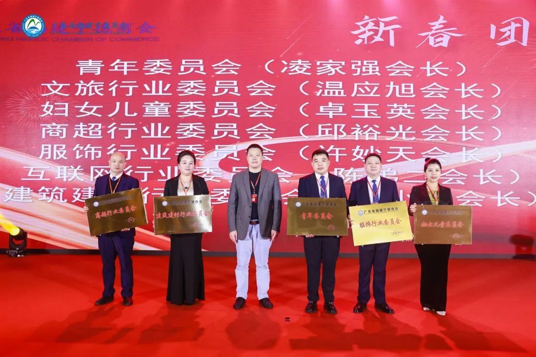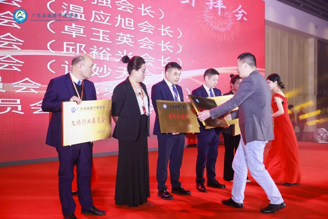 授牌仪式环节,朱东炫会长为广东省福建宁德商会古田分会、寿宁分会、屏南分会、柘荣分会、珠海分会、蕉城分会以及霞浦分会的各个分会会长颁发牌匾。 理事长袁振斌为文旅行业委员会、互联网行业委员会、妇女儿童委员会、青年委员会、服饰行业委员会、建筑建材行业委员会、商超行业委员会的各行业委员会会长颁发牌匾。