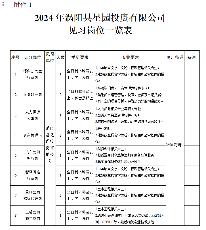 涡阳县星园投资有限公司2024年招聘见习生公告
