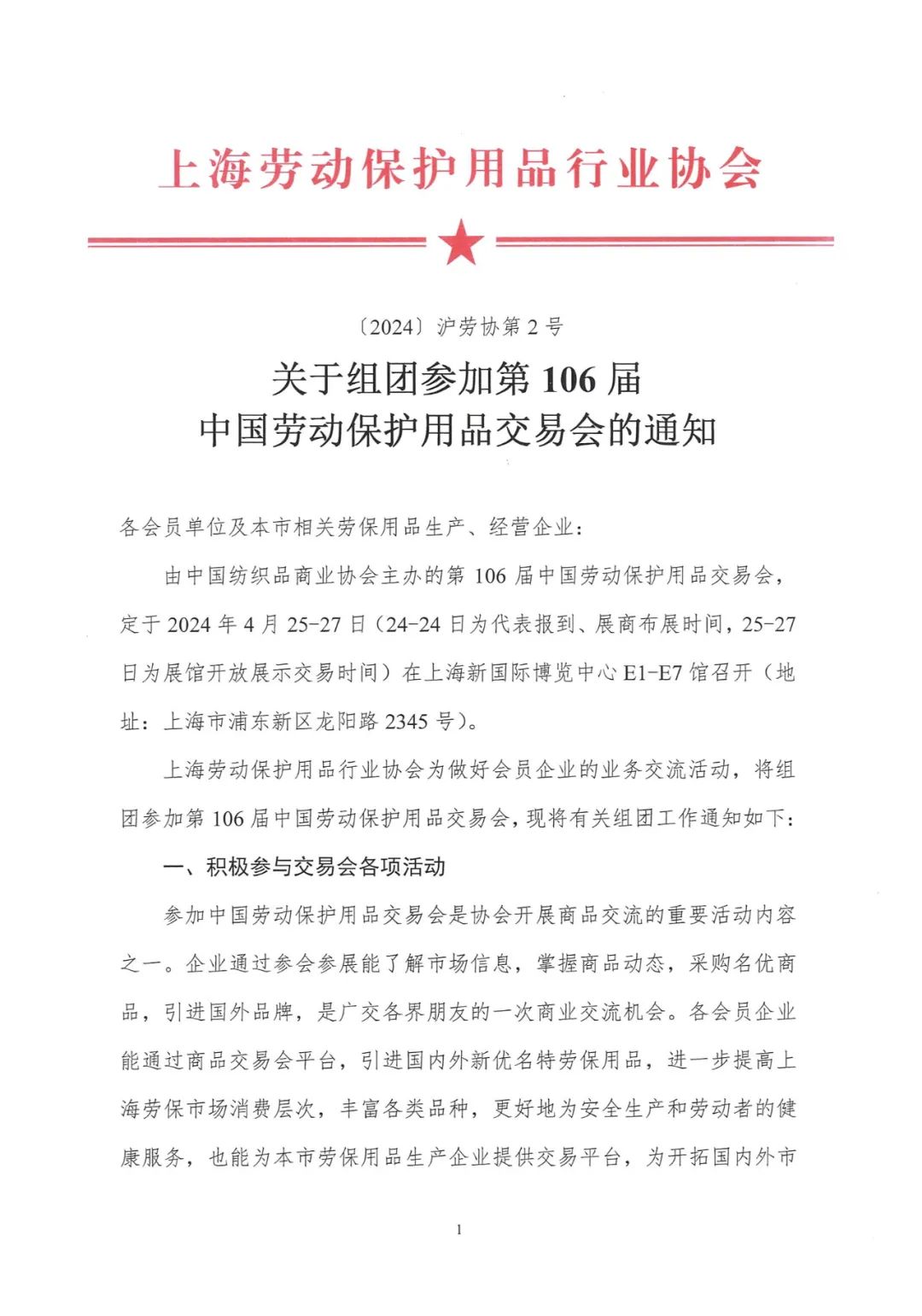 上海劳动保护用品行业协会为做好会员企业的业务交流活动,将组团参加第106届中国劳动保护用品交易会,现将有关组团工作通知如下: