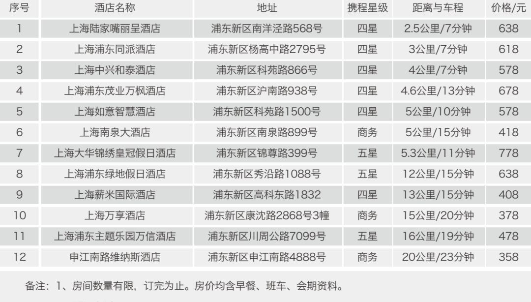 1、本届大会由上海远欧会展服务有限公司执行酒店预订各项事宜。大会酒店接受参展商3天以上,专业观众2天以上预订。房价含早餐、班车及会期资料。房间数量有限,先订先得,订完为止。