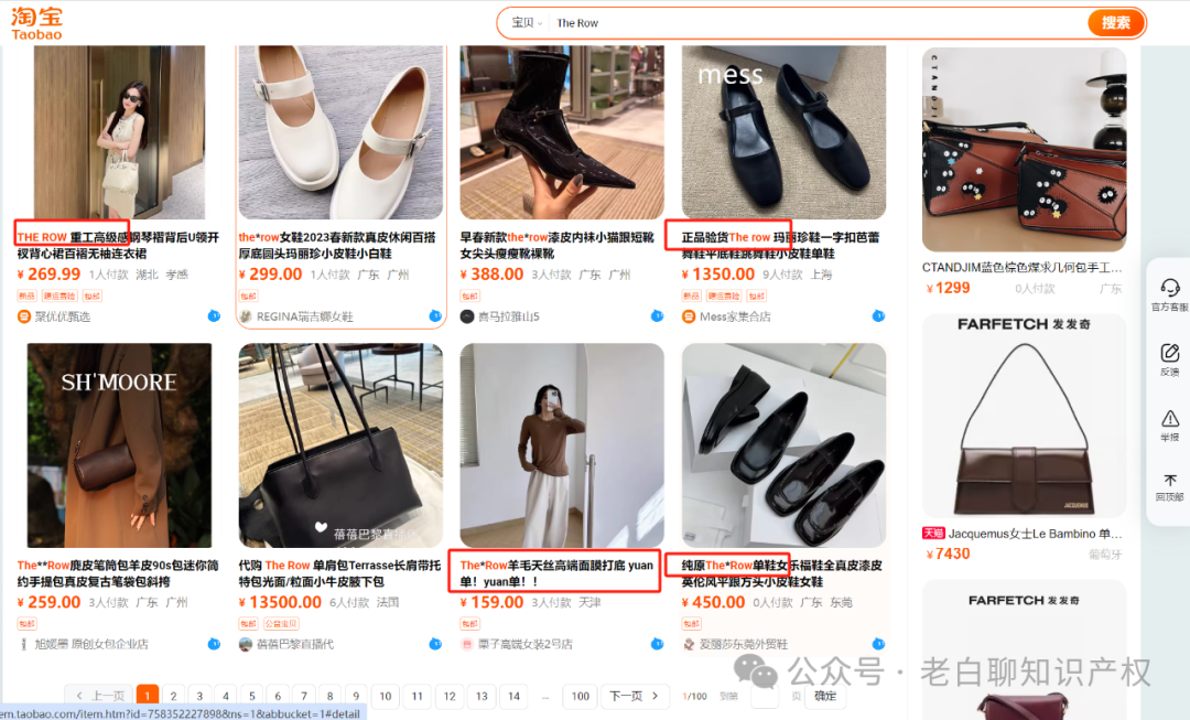 其实The Row之前从未被排查,也不曾有过权利人的售假投诉,因此很多的淘宝卖家们都在放心的囤货和销售,目前老白查询淘宝上销售此品牌的链接,依然还有多达几百页: