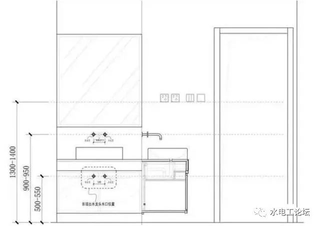 洗漱台:如果水龙头不是墙出的话,那出水口一般离地面净尺寸在500-55mm左右;如果式墙出水龙头的户啊,那出水口要在离地面距离净尺寸900-95mm!