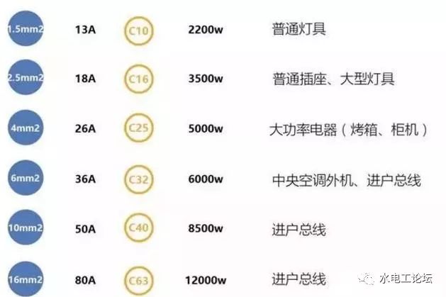 (1)如下图,1.5mm2的电线安全载流量为13A,断路器规格C10,如果在使用中超过这个,那就会自动跳转,这减少了后期在使用中被烧坏的可能,安全承载功率2200w,满足普通灯具需要。