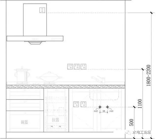 洗菜池:出水口距地面净尺寸的一般在400-50mm左右,设置冷热出水口,也要遵循左热右冷。预留净水机出水口一个。