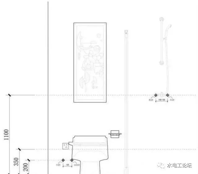 淋浴龙头混水器:一般离地面净尺寸出水口1100mm,冷热出水口左右管距145-150mm。设置冷热出水口,冷热水管应左热右冷。