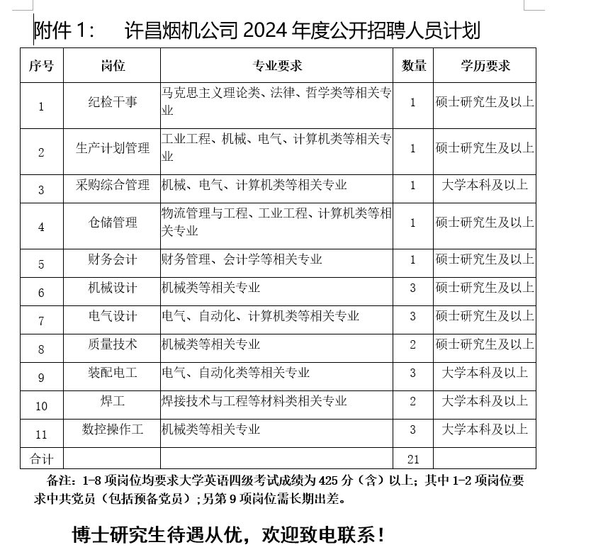 本次计划公开招聘21人,具体岗位及专业学历要求详见附件1:《许昌烟机公司2024年度公开招聘人员计划》。