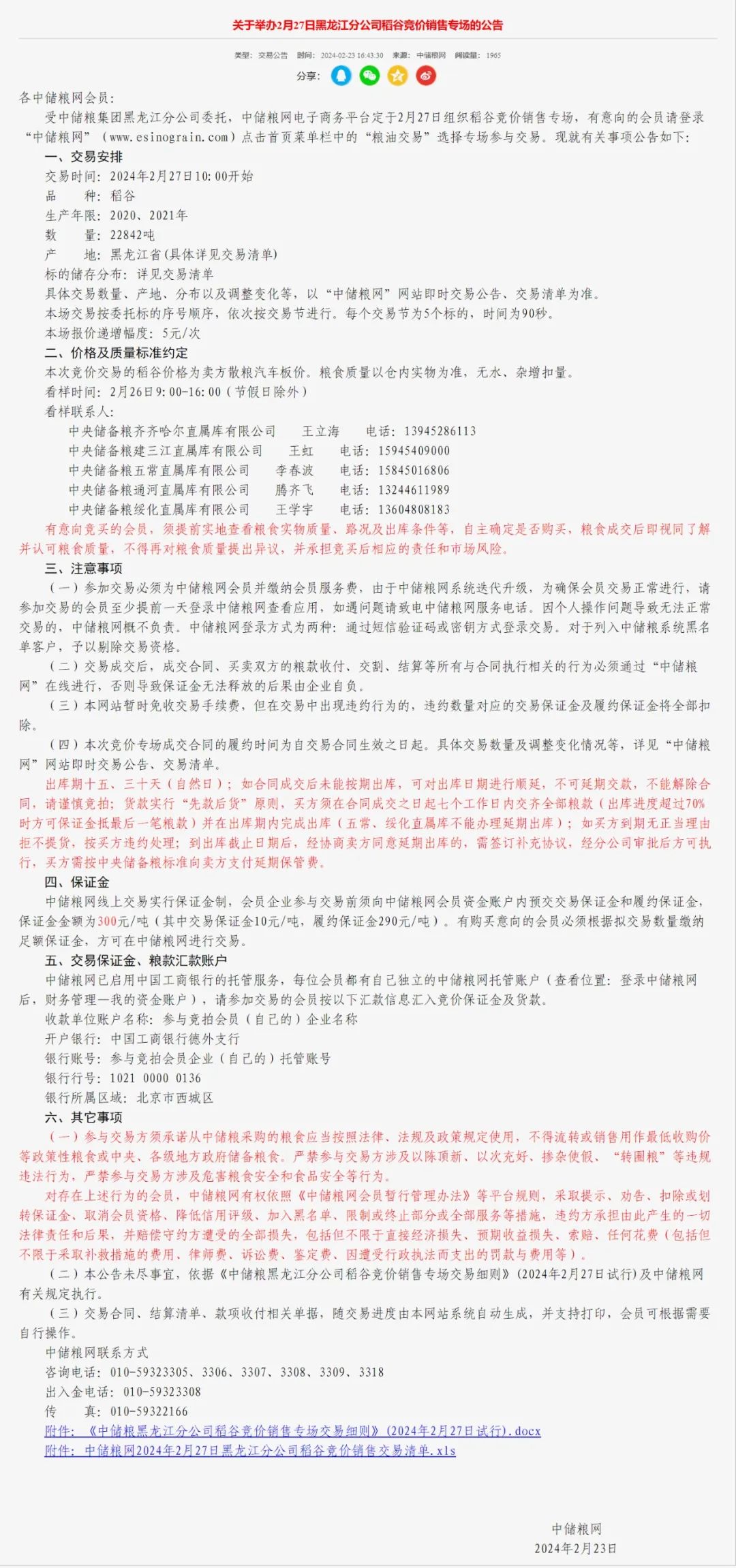 关于举办2月27日黑龙江分公司稻谷竞价销售专场的公告
