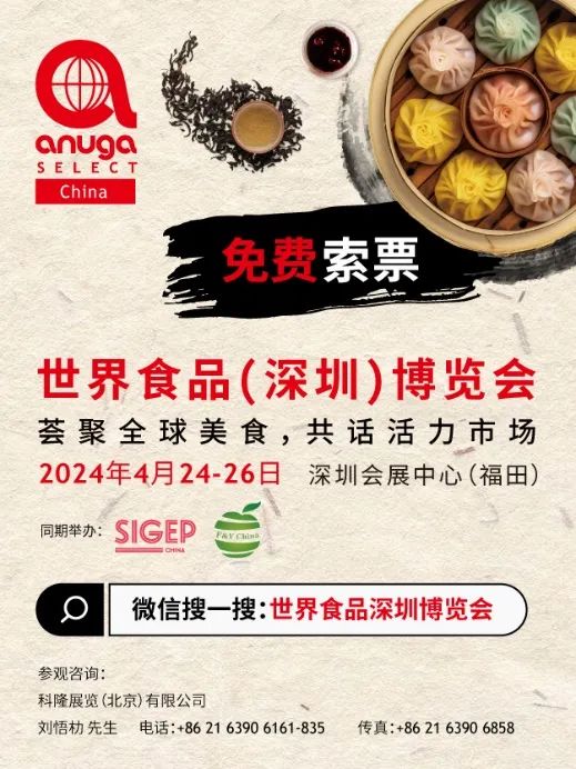 4月24-26日,由科隆展览、中国食品土畜进出口商会、深圳市零售商业行业协会共同主办Anuga Select China 2024世界食品(深圳)博览会,将在深圳会展中心(福田)举办。本届展览总面积预计达到40,000平方米,将吸引全球800+参展商,涵盖甜食及休闲食品、肉类、乳制品、精细食品、海产及冷冻食品、植物基及健康食品、咖啡与茶、饮料(酒精与非酒精)、食品与饮料技术、餐饮服务与技术等食品与饮料全产业链。