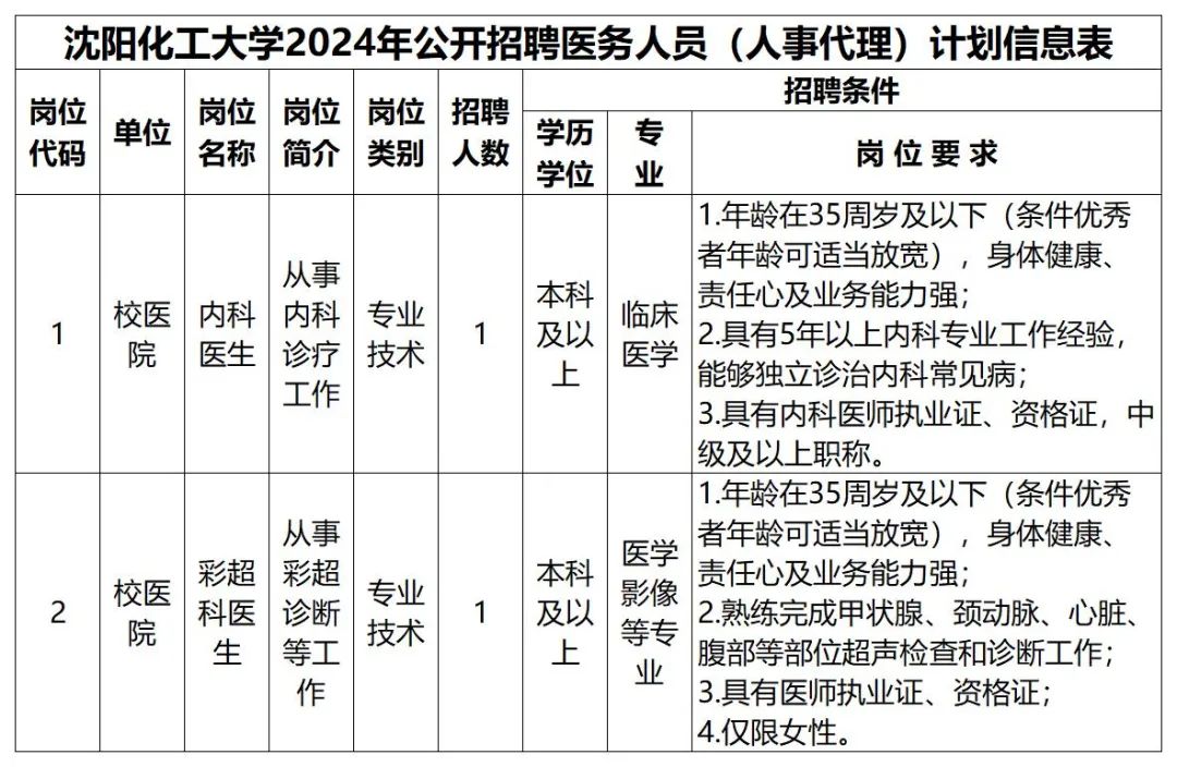 小护招聘温馨提示:沈阳化工大学校医院,2024年招聘内科医师、彩超科影像医师。欢迎人才加入我院!