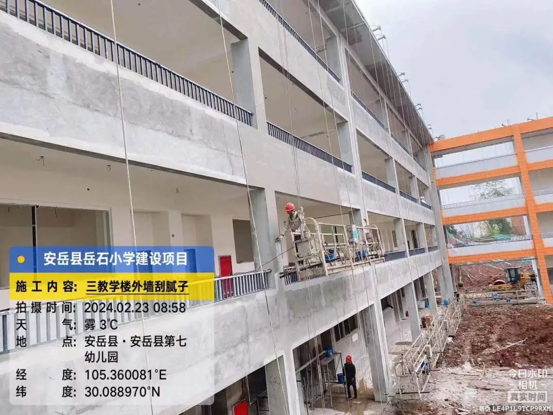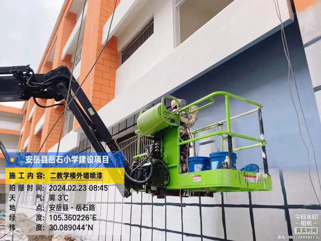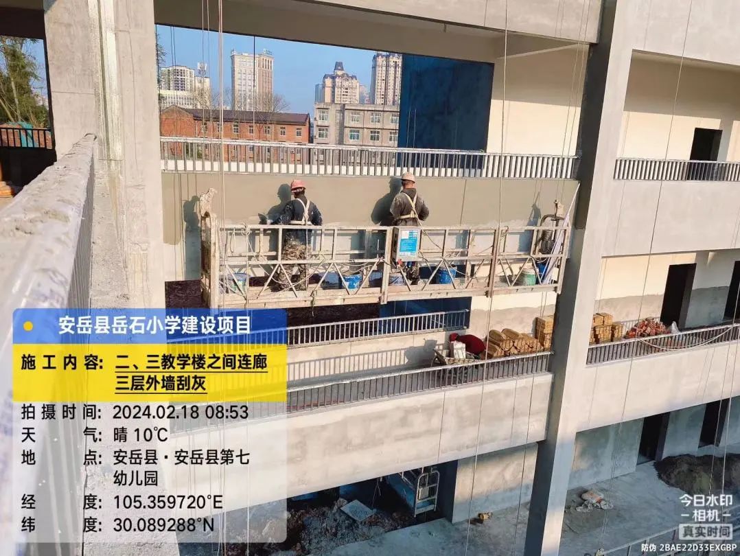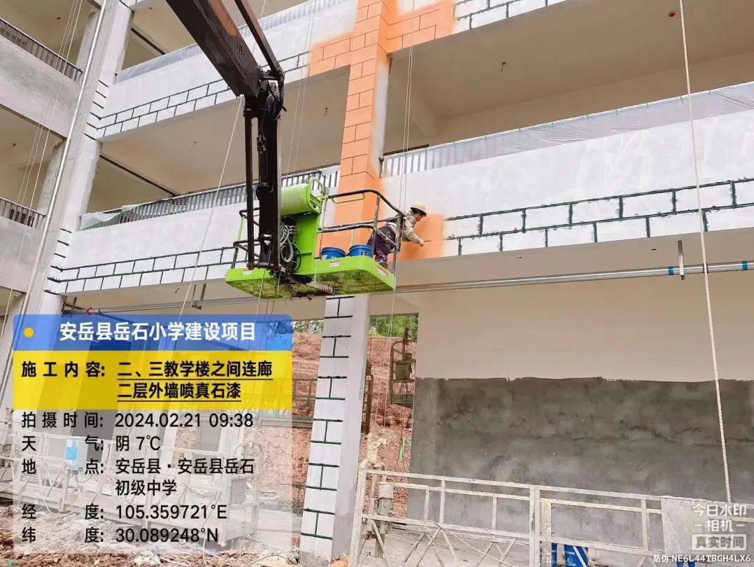 2号教学楼外墙喷真石漆,2号、3号教学楼之间连廊三层外墙刮灰。