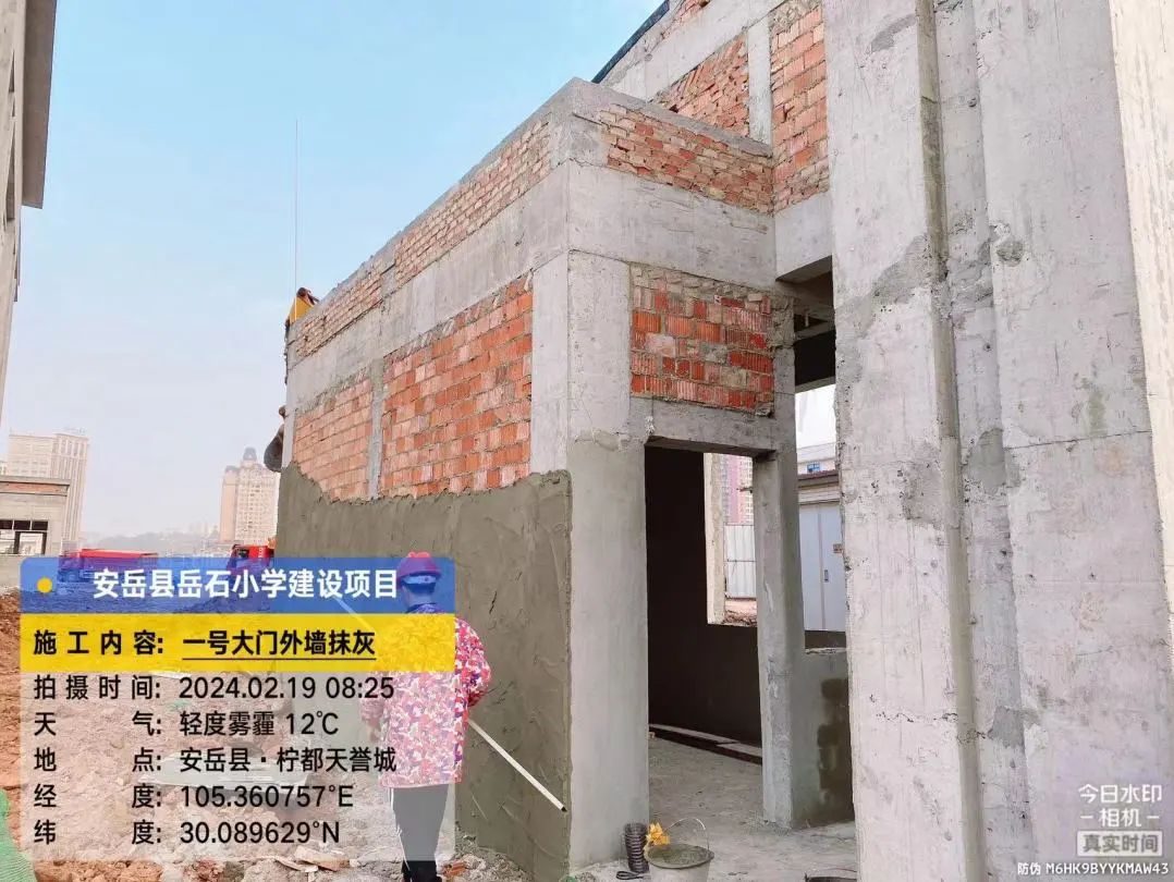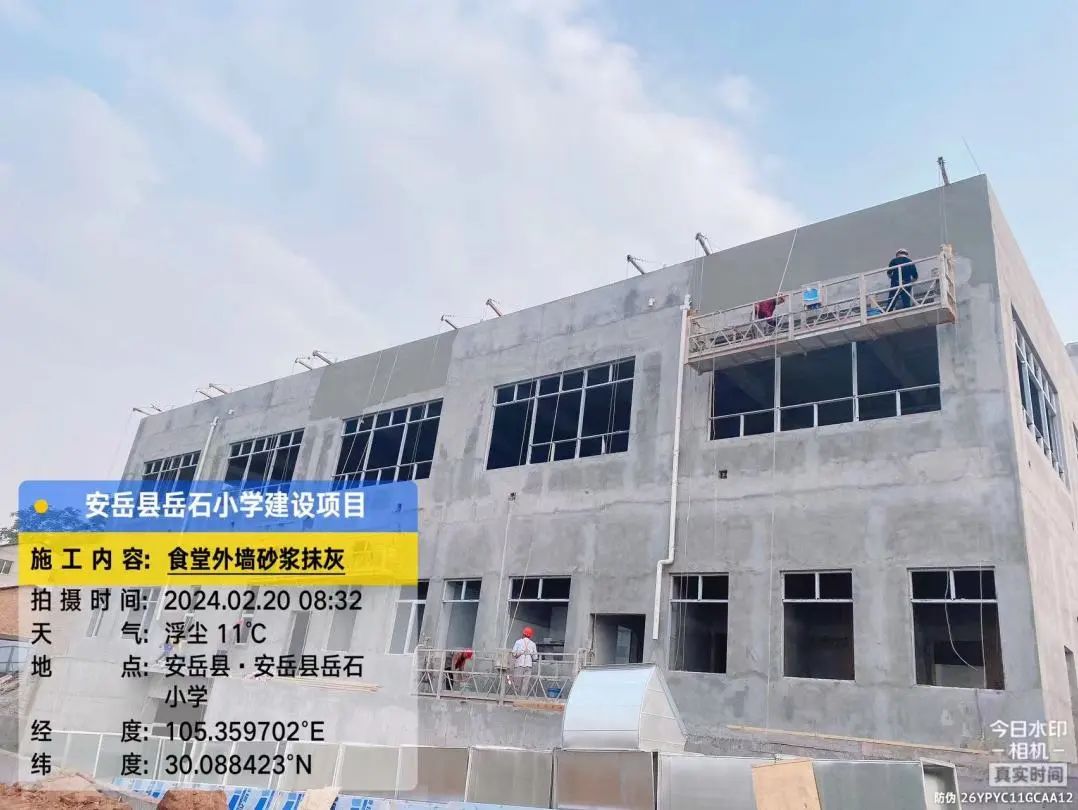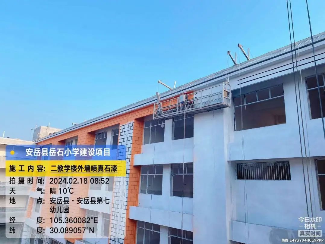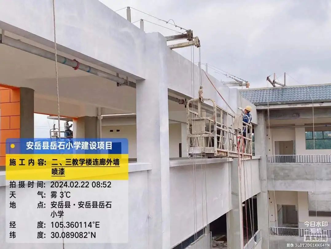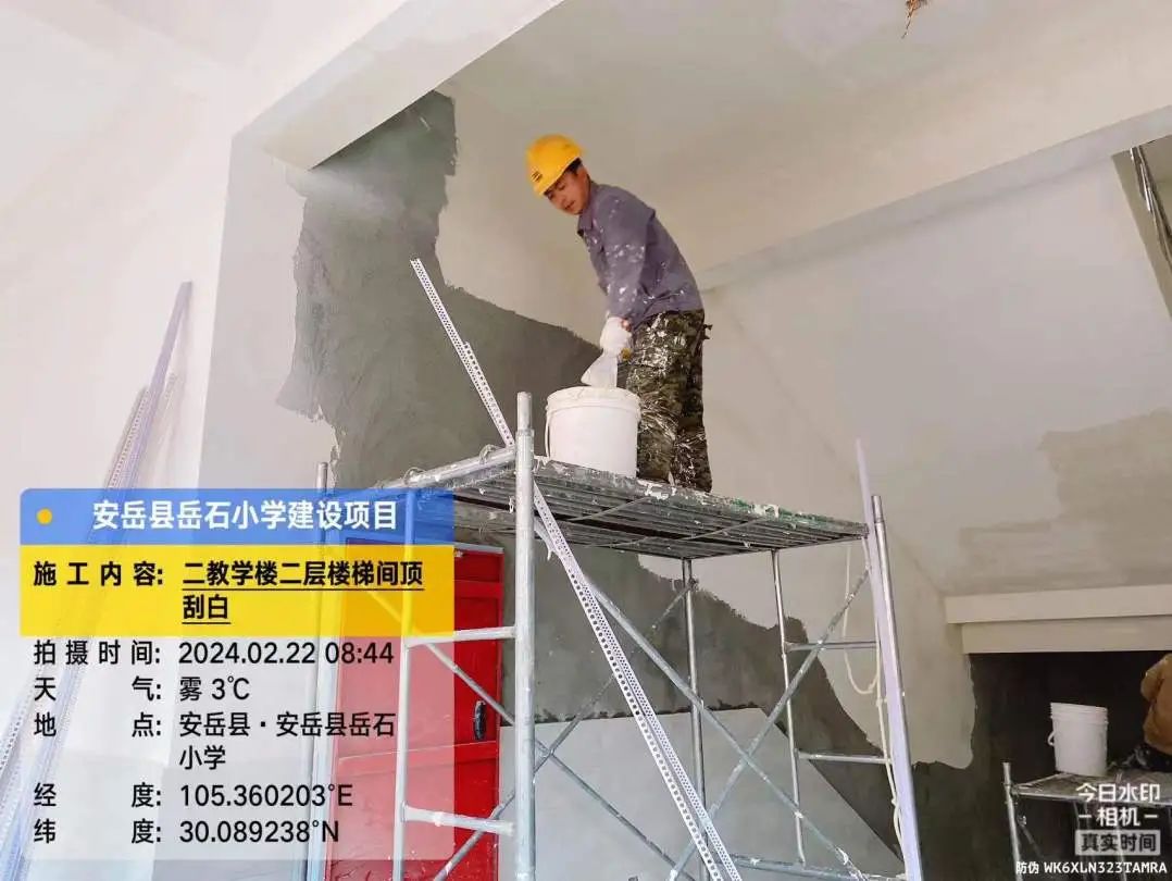 2号教学楼外墙喷真石漆,2号、3号教学楼之间连廊三层外墙刮灰。