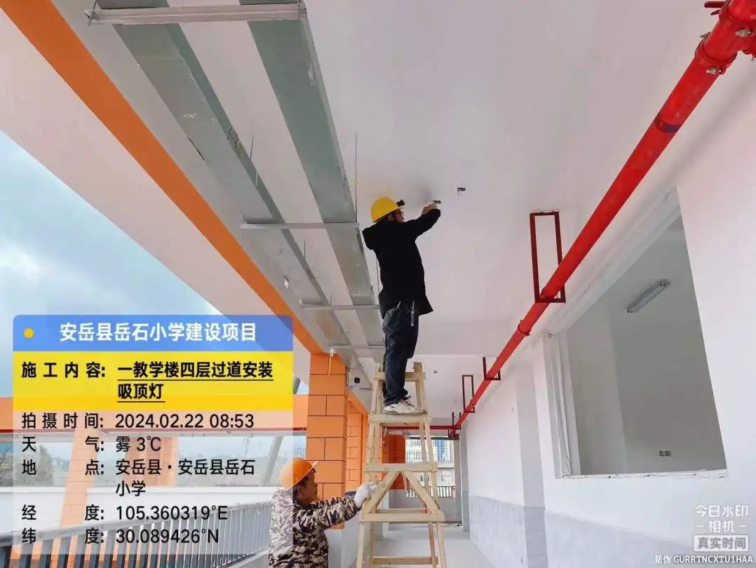 1号教学楼第四层过道安装吸顶灯,2号、3号教学楼连廊外墙喷漆,2号教学楼第二层楼梯间顶刮白,食堂第一操作间贴墙砖,操场排水沟安装盖板。
