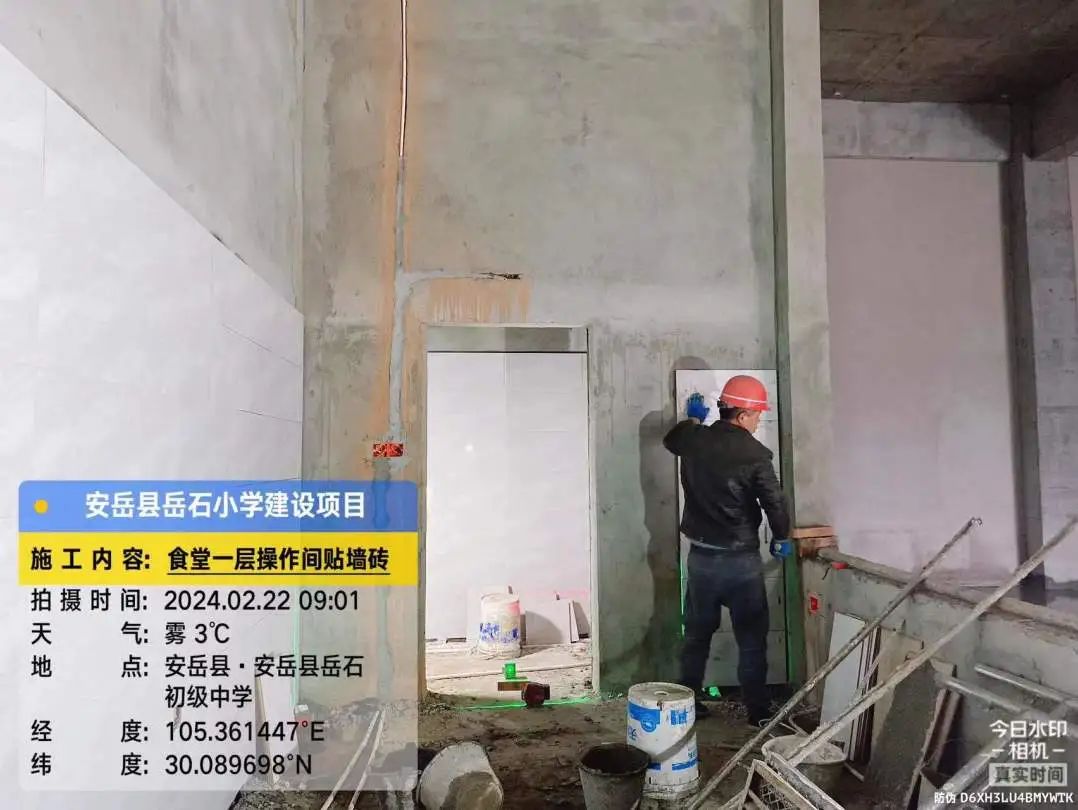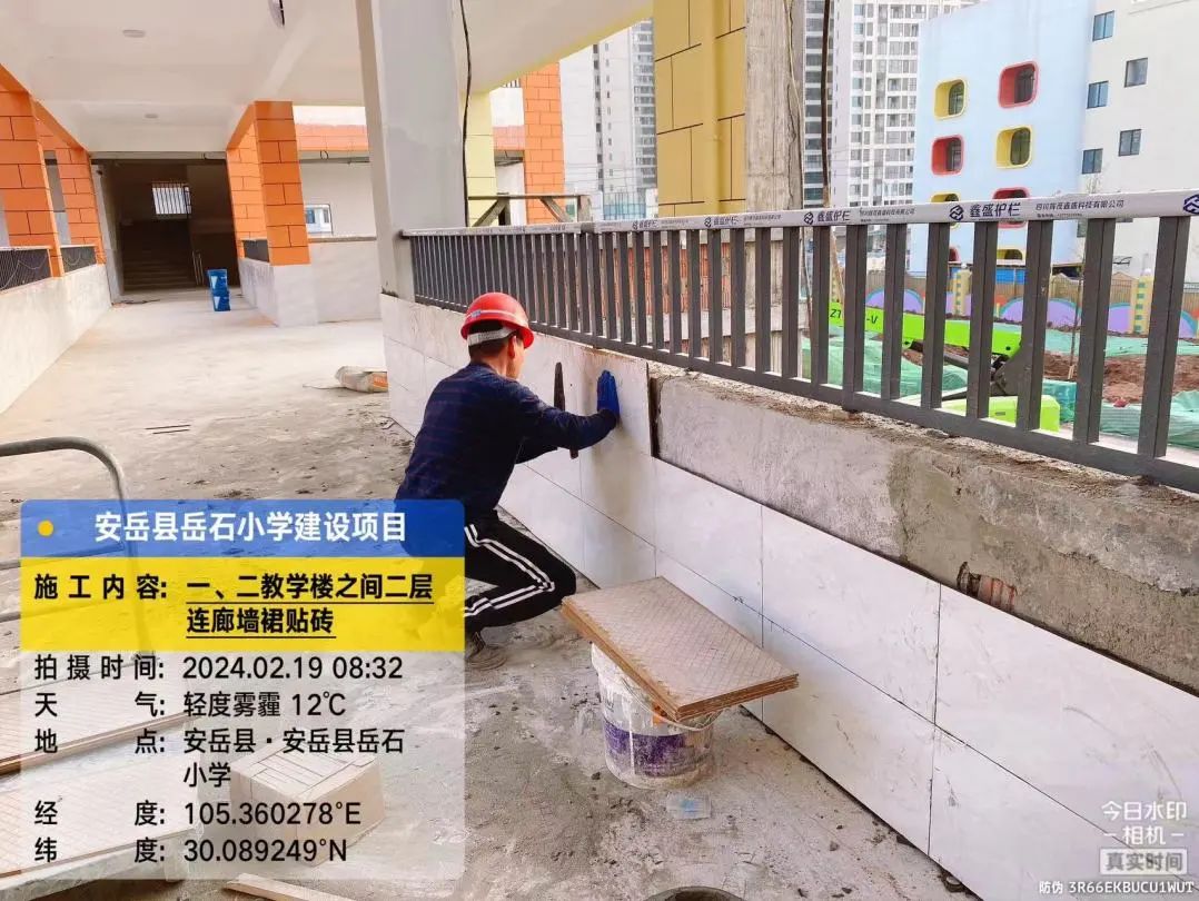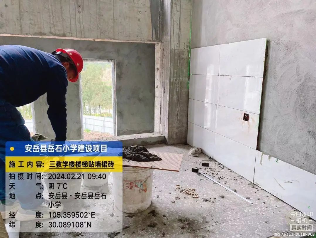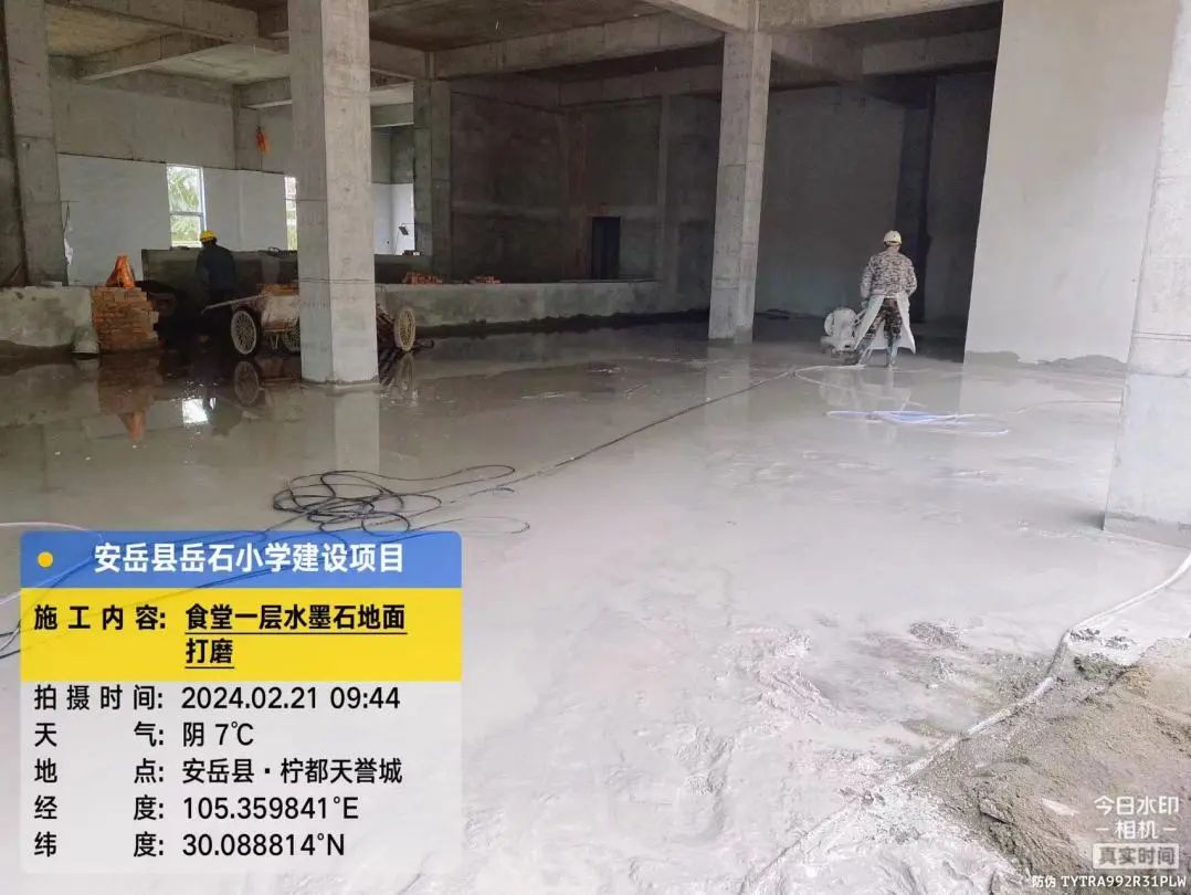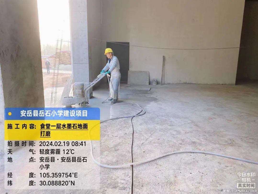 3号教学楼楼梯墙裙贴砖,2号、3号教学楼之间连廊二层外墙喷真石漆,食堂第一层水磨石地面打磨。