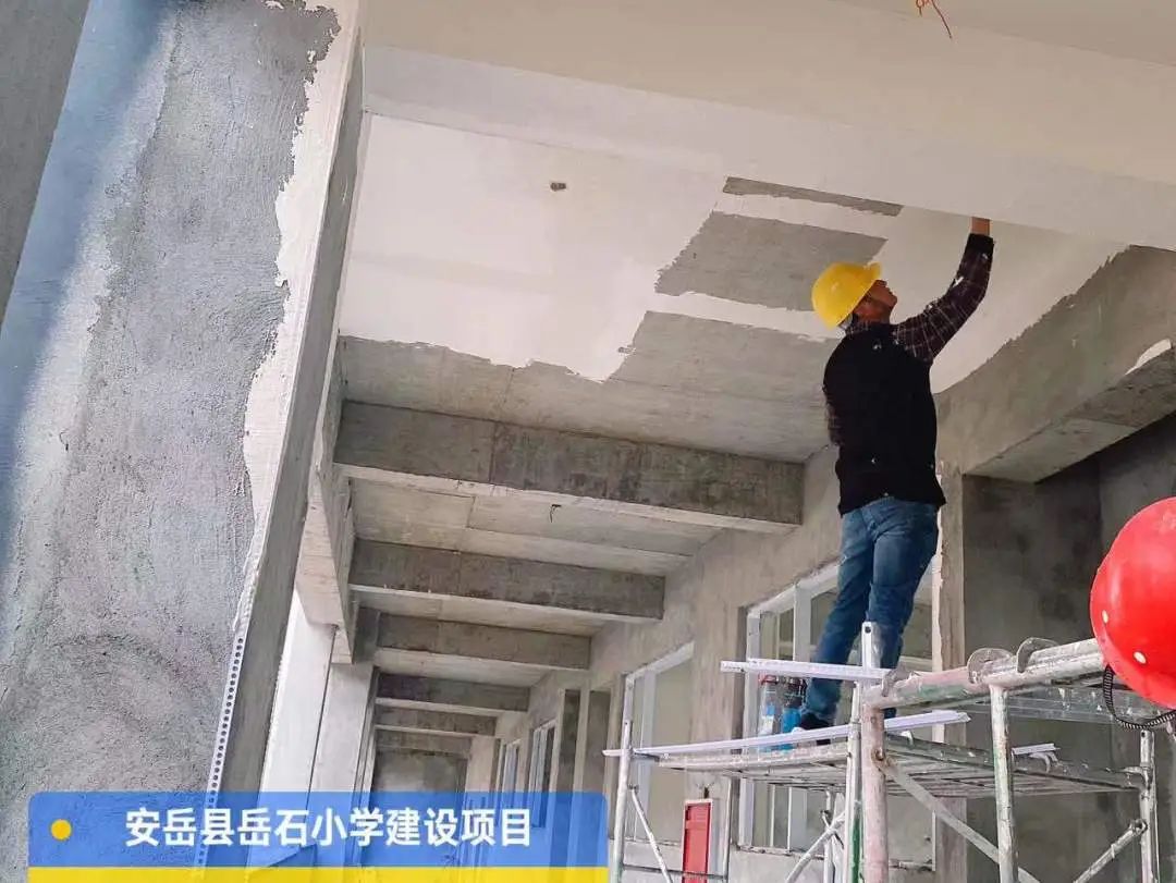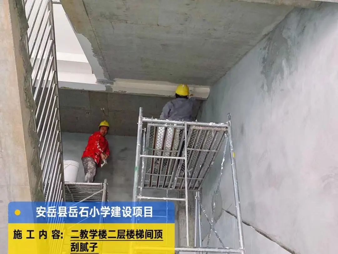 综合楼外墙抹灰,2号教学楼第二层楼梯间顶刮白,食堂外墙抹灰。