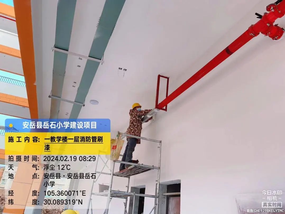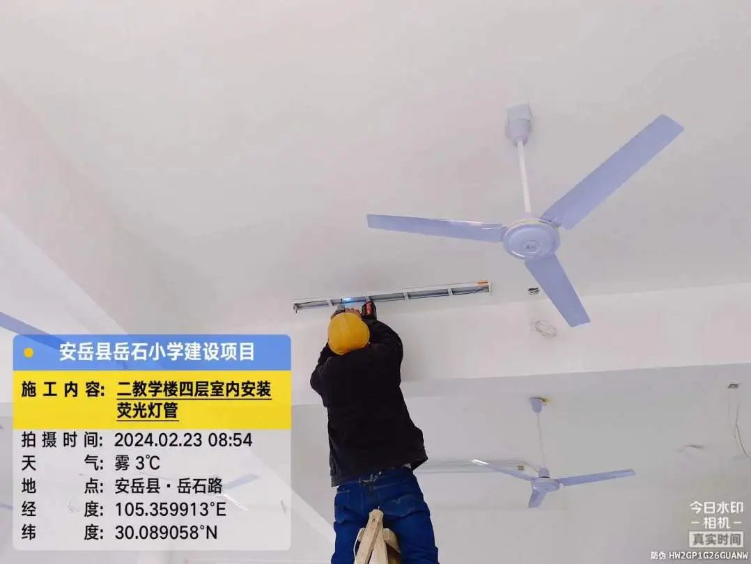 2号教学楼第四层室内安装荧光灯管,2号教学楼外墙喷漆,3号楼外墙刮白,综合楼第三层过道顶刮白,总坪围墙砌筑。