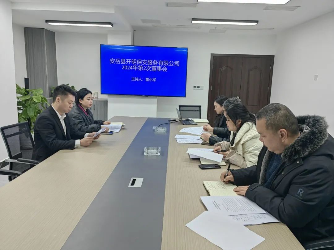 ▶ 盛安集团副总经理董小军主持召开开明保安公司2024年第2次董事会,开明保安公司董事会成员和监事参加。