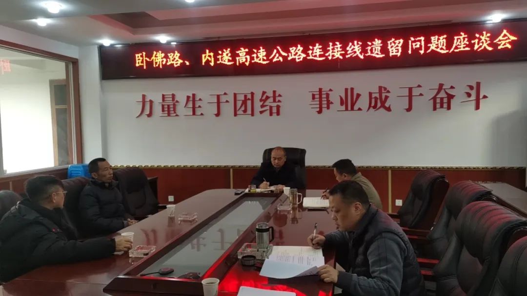 ▶ 县交通运输局党组书记安从敏、局长陈勤组织专题研究卧佛路、内遂高速公路连接线遗留问题处置工作,交投司负责人参加。