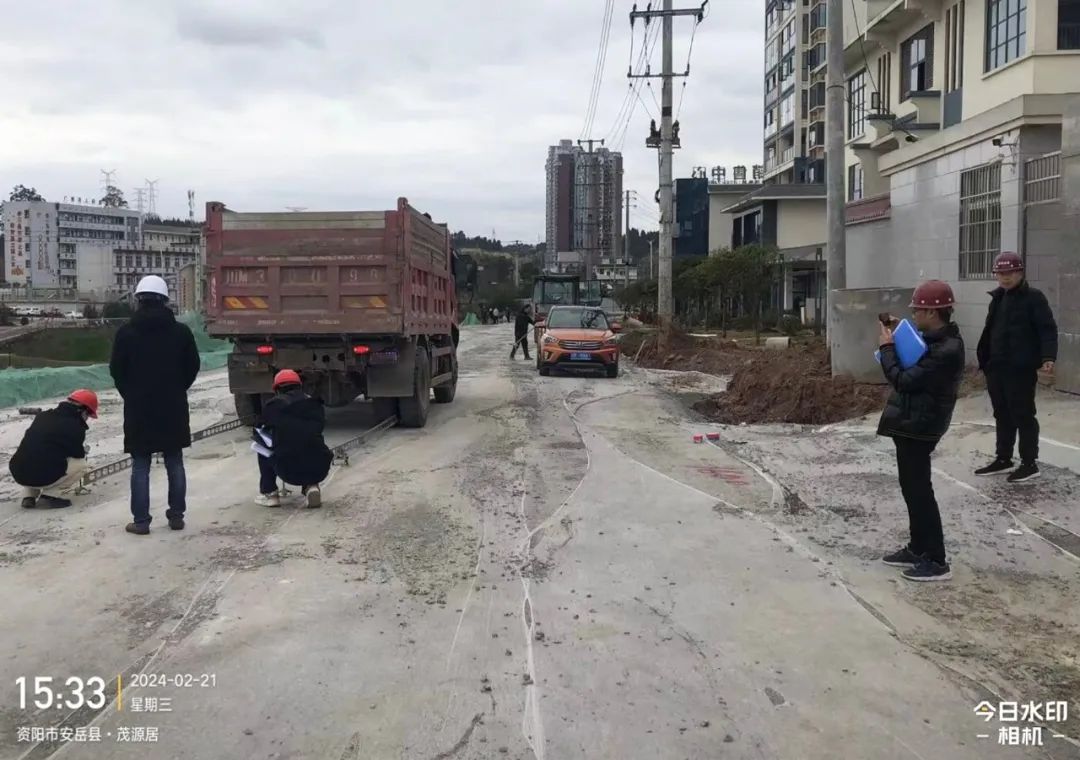 ▶ 2月21日,拓北监理公司参与安岳县柠都河东侧片区支路网项目1号路水稳层弯沉检测、无侧限抗压钻心取样检测及验收。