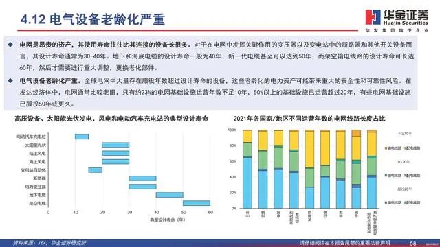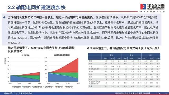 全球电网长度到2050年将翻一番以上,超过一半的现有电网需要更换。在承诺目标情景中,从2021年到2050年全球电网总长度将增加一倍多,达到1.66亿公里。配电线路仍将占线路总长度的90%以上,连接数十亿用户,满足他们的日常需求。输电网线路总长度将从2021年的530万公里增加到2050年的1270万公里。各地区经济和电气化底层发展变化不同,因此电网发展道路也不同。在发达经济体中,从2021年到2050年电网总长度将增加50%,而同期新兴市场和发展中经济体的电网总长度将增加150%以上。到2050年,新兴市场和发展中经济体的输电线路将达到近1.2亿公里,比2021年全球已安装线路总长度高出50%以上。