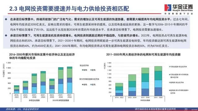 承诺目标情景下,可再生能源装机投资持续增长,电网投资则跳脱近期的平稳趋势,与前者同步增长。2022年,电网投资占可再生能源和电网投资总和的30%。承诺目标情景下,2021-2030十年期间,电网投资将赋能进一步可再生能源发电转型,年均投资额达到可再生能源和电网投资总和的40%,约为4500亿美元;2041-2050年期间,年均电网投资将占可再生能源和电网投资总和的50%,约为8700亿美元。