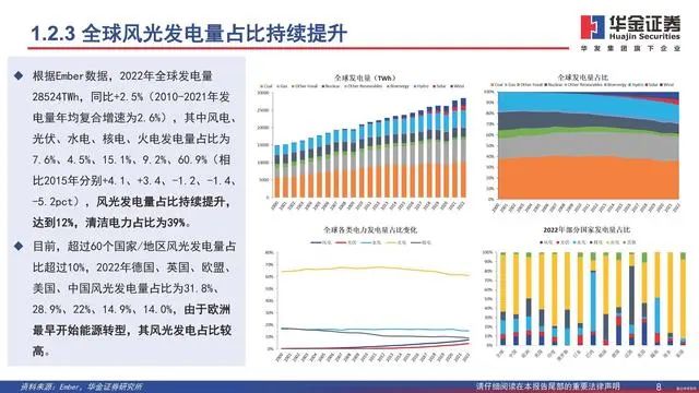 根据Ember数据,2022年全球发电量 28524TWh,同比+2.5%(2010-2021年发 电量年均复合增速为2.6%),其中风电、 光伏、水电、核电、火电发电量占比为 7.6%、4.5%、15.1%、9.2%、60.9%(相 比2015年分别+4.1、+3.4、-1.2、-1.4、 -5.2pct),风光发电量占比持续提升, 达到12%,清洁电力占比为39%。目前,超过60个国家/地区风光发电量占 比超过10%,2022年德国、英国、欧盟、 美国、中国风光发电量占比为31.8%、 28.9%、22%、14.9%、14.0%,由于欧洲 最早开始能源转型,其风光发电占比较 高。