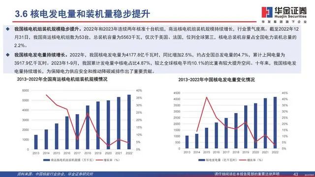 我国核电建设正在高速发展。我国核电“热堆-快堆-聚变堆”三步走路线明确,并持续取得突破。2023年12月,全球首座第四代核电站——华能石岛湾高温气冷堆核电站商业示范工程投产, “华龙一号”已成功落地巴基斯坦,并与沙特、阿根廷、巴西等20多个国家和地区形成核电项目合作意向。