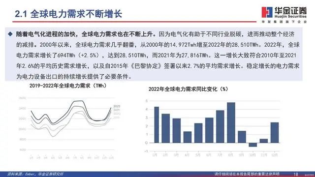 随着电气化进程的加快,全球电力需求也在不断上升。因为电气化有助于不同行业脱碳,进而推动整个经济的减排。2000年以来,全球电力需求几乎翻番,从2000年的14,972Twh增至2022年的28,510TWh。2022年,全球电力需求增长了694TWh(+2.5%),达到28,510TWh,而2021年为27,816TWh。这一增长大致符合2010年至2021年2.6%的平均历史需求增长,以及自2015年《巴黎协定》签署以来2.7%的平均需求增长。稳定增长的电力需求为电力设备出口的持续增长提供了必要条件。