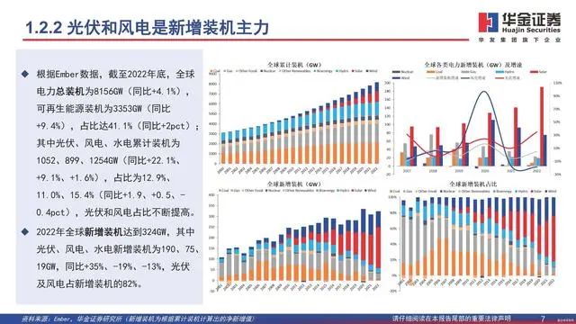 根据Ember数据,截至2022年底,全球 电力总装机为8156GW(同比+4.1%), 可再生能源装机为3353GW(同比 +9.4%),占比达41.1%(同比+2pct); 其中光伏、风电、水电累计装机为 1052、899、1254GW(同比+22.1%、 +9.1%、+1.6%),占比为12.9%、 11.0%、15.4%(同比+1.9、+0.5、- 0.4pct),光伏和风电占比不断提高。 2022年全球新增装机达到324GW,其中 光伏、风电、水电新增装机为190、75、 19GW,同比+35%、-19%、-13%,光伏 及风电占新增装机的82%。
