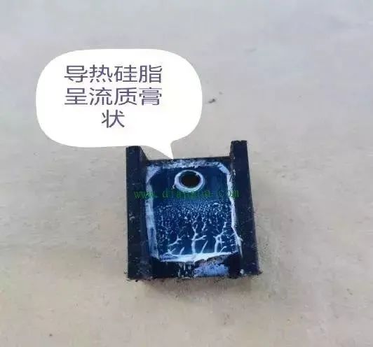 岂料近几日随着气温升高,这台变频器又发生了“超温”保护故障。无奈本人只好再次披挂上阵。经检查变频器冷却风扇、温度检测电路均正常,就当本人为此纳闷之时,本人无意之间却发现早前拆卸的IGBT周围应为流质膏状的“导热硅脂”居然凝固成了固态!diangon.com独家原创稿件 版权所有。本人心中一惊,连忙拿出那盒“导热硅脂”,结果却发现这和原用导热硅脂包装一模一样的产品居然是——硅酮导热胶(习惯称之为导热硅胶)!这货热传导性能可比导热硅脂差远了!喊来采购员一问,方知他当初购买时导热硅脂无货,他自认为导热硅脂与导热硅胶仅一字之差,应该通用便买了来。