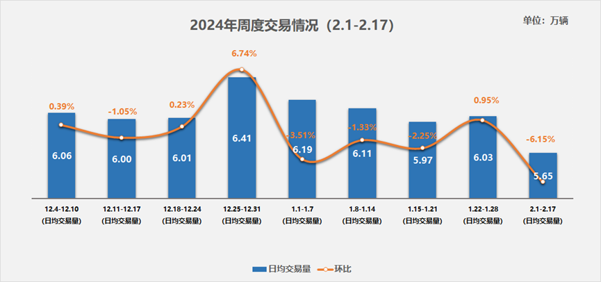 2024年2月1日-17日,工作日8天,二手车日均交易量5.65万辆,较1月最后一周相比交易量下降了6.15%。按可比口径计算,2024年2月1日-17日,二手车交易量45.2万辆,较1月同期下降41%。从调研结果显示2月前两周,有一半以上的二手车经销商表示客流量较1月底有所减少,认为成交量有所下降的占到40%。春节前的消费需求在1月份已基本转化完毕,1月二手车共交易168.84万辆,环比增长1.65%,同比增长35.26%。2月初的消费能力表现不强,市场需求下降明显。但春节期间,很多二手车经销商也表示用户咨询量相对往年增加不少,还有不少车商提前开门营业,或者线上直播卖车。因此2月份的二手车市场或将延续1月的开门红。