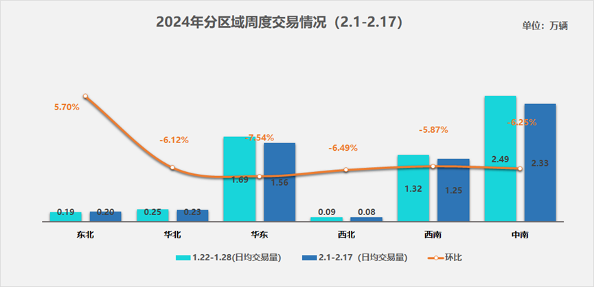 西北地区是六大区中交易占比最小的地区,日均交易量0.08万辆,环比下降6.49%。兰州、西安、榆林、西宁等主要城市交易量有较为明显的下降,榆林降幅超过20%。吴忠和巴州节前市场有较为明显的回升,其余地区本周市场波动相对较小。