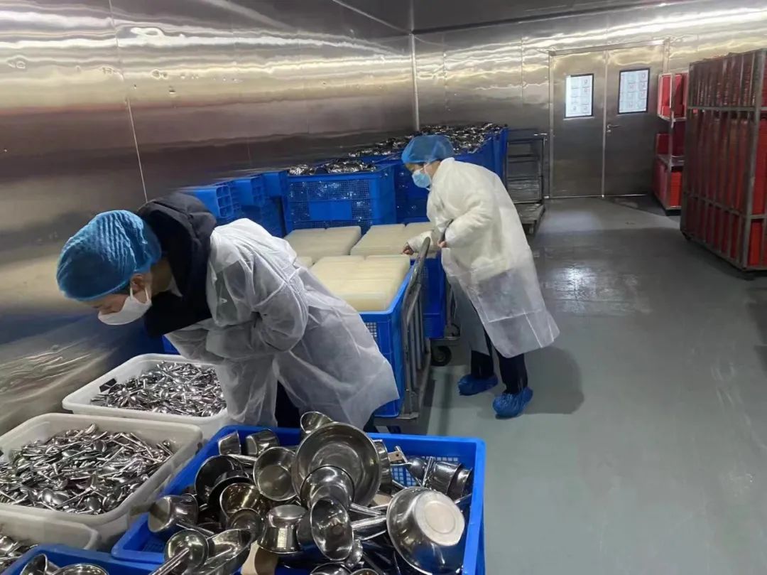 检查组一行对餐具消毒、新学期的食材准备、前期库存是否清理、整体卫生情况等方面进行逐一排查。