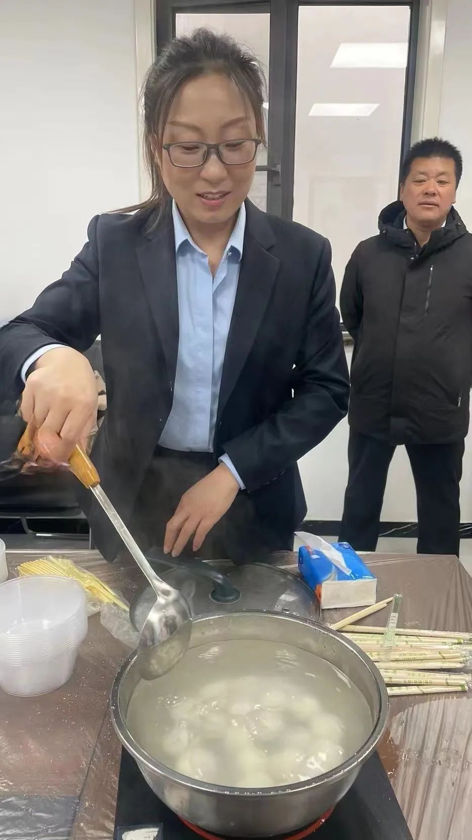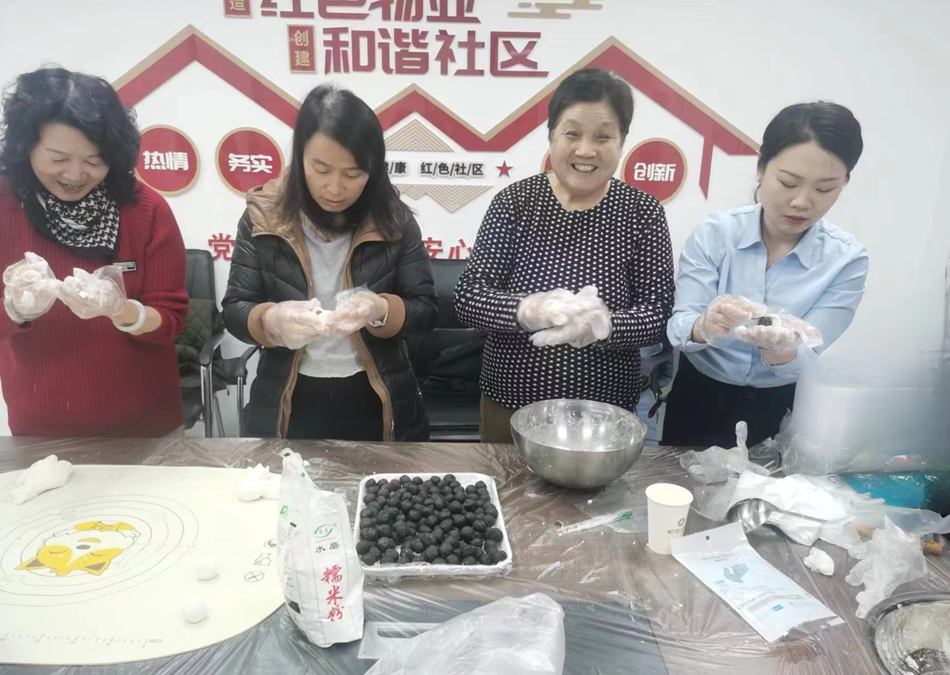 业主与物业工作人员一起包汤圆