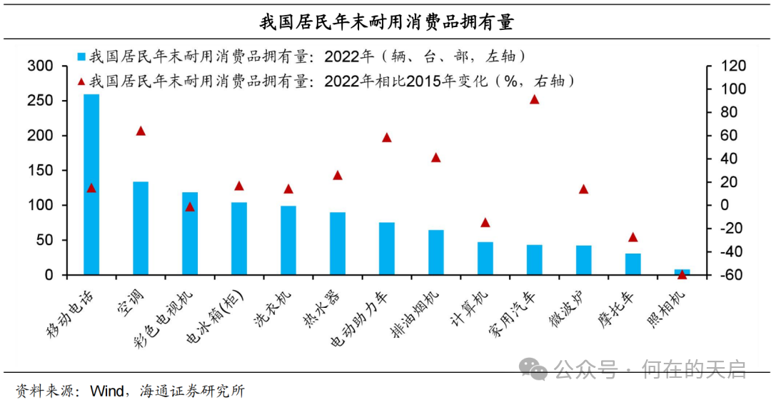 本次会议提出,鼓励汽车、家电等传统消费品以旧换新,推动耐用消费品以旧换新。截至2022年末,从我国耐用消费品拥有量看,移动电话、彩电以及空调等白色家电规模领先。相比2015年,2022年家用汽车、空调、电动助力车、排油烟机的增幅分别达到91.6%、64.3%、58.6%、41.4%,相比之下,彩电、计算机、摩托车、照相机的降幅分别为0.8%、14.4%、27%、59.3%。