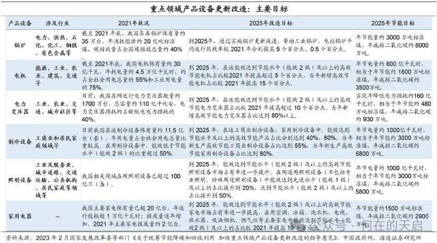 去年12月的中央经济工作会议,就强调要“着力扩大国内需求”,其中提到“要以提高技术、能耗、排放等标准为牵引,推动大规模设备更新和消费品以旧换新。”我们认为,提高技术、降低能耗、减少排放或是本轮设备更新的重要方向。其实在2023年2月的时候,国家发展改革委等9部门联合印发《关于统筹节能降碳和回收利用加快重点领域产品设备更新改造的指导意见》,首批聚焦锅炉、电机、电力变压器、制冷、照明、家用电器等6类产品设备,并且配套印发了更新改造和回收利用实施指南(2023年版)。