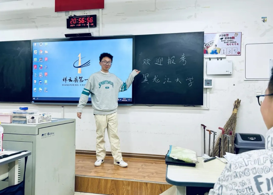 随后,队员们针对黑龙江大学的悠久历史与优良学风展开介绍。其中,汪月华同学以过来人的身份,分享自己在备战高考时的经验以及高考给自己带来的心得体会;以一名大学生的身份,分享了自己丰富多彩的大学生活、在大学里的所思所感;以一名黑大学子的身份,介绍了黑龙江大学,分享了黑龙江大学的优势所在。