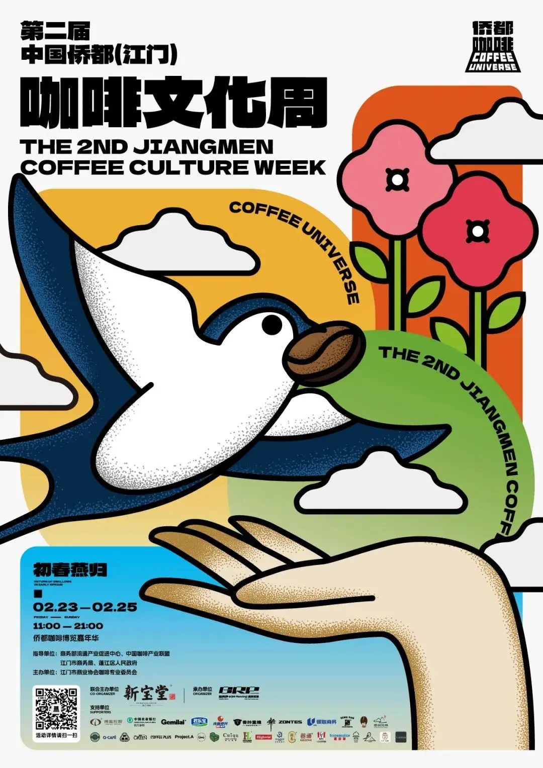 其中,活动的重头戏——本届侨都咖啡博览嘉年华,将持续至2月25日,每天11:00-21:00在五邑华侨广场举办,以“初春燕归”为主题,灵感来源于江门地标性景观“春燕雕塑”,象征江门先贤拼搏进取、敢为天下先的精神,寓意江门在新发展阶段,乘势而上,勇毅前行的坚定信心,同时也致敬江门的海外华侨将舶来品咖啡带回故乡,把咖啡文化送到千家万户。