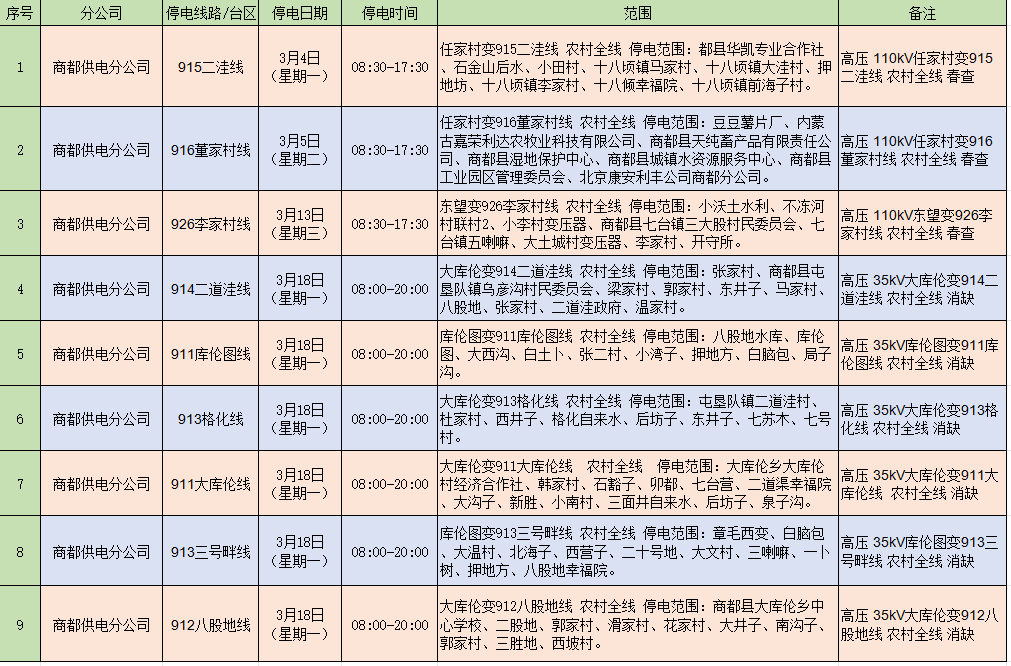 乌兰察布供电公司3月4日-18日计划检修停电公告