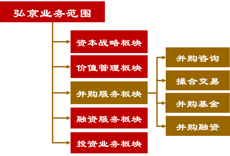 弘京资本隶属于专业化资本市场服务机构——弘京企业管理,弘京企业管理以上市公司为核心客户群体,开展综合服务,下设五大板块:资本战略板块、价值管理板块、并购重组板块、融资服务板块、投资业务板块。其中,并购重组板块是弘京开展上市公司综合服务最重要的抓手,下设四大业务条线。