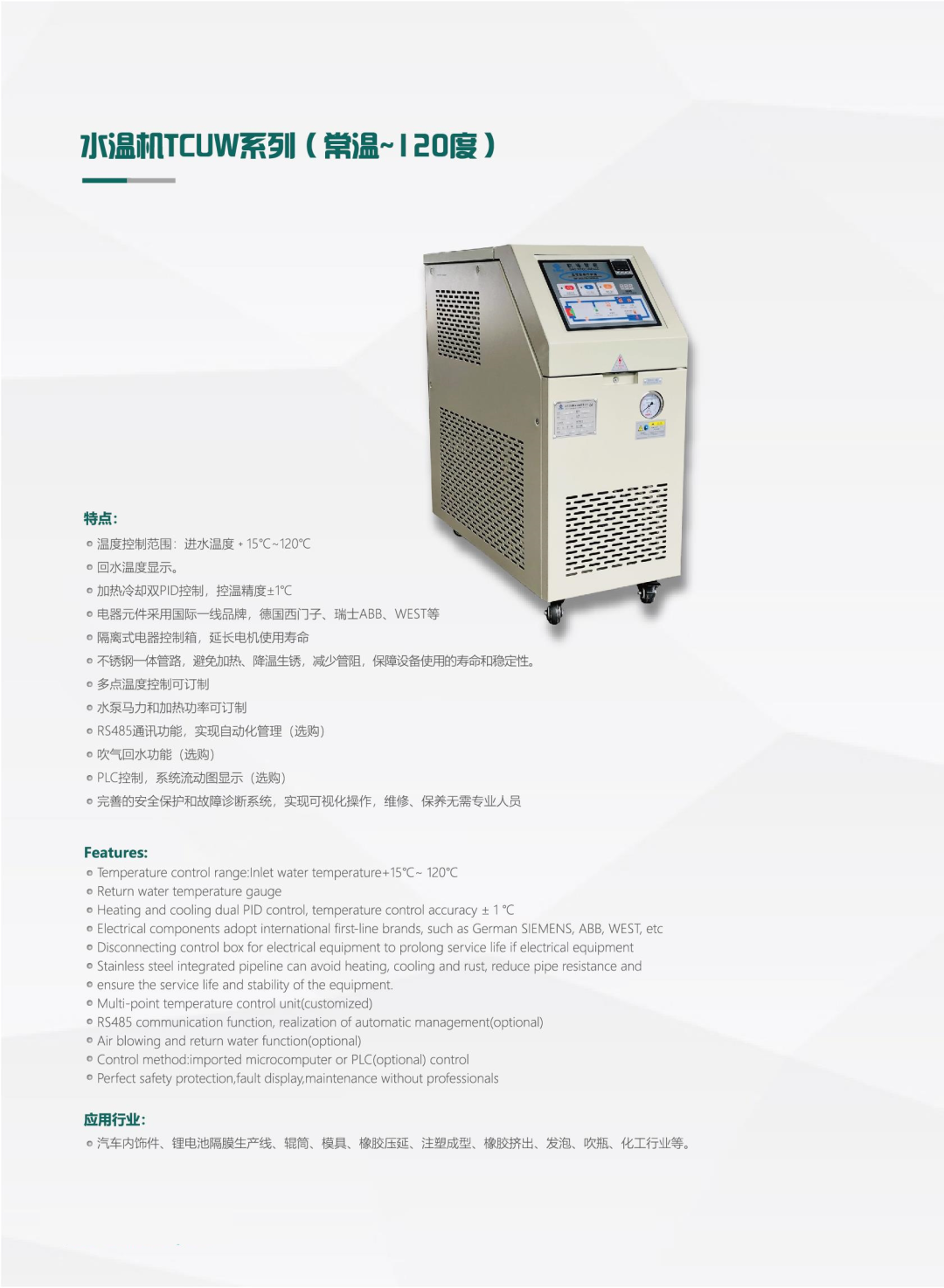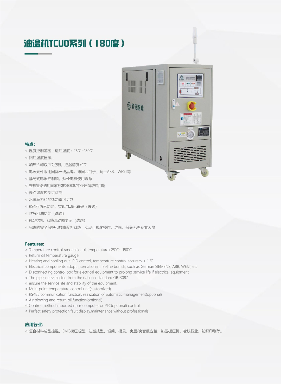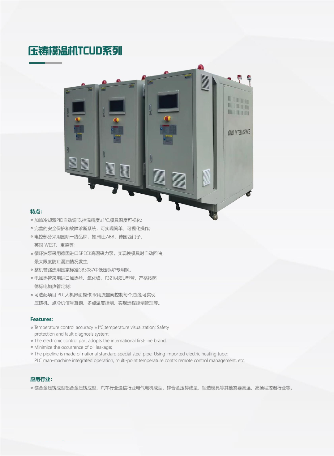 公司主要生产有模温机、油温机、水温机、冷热一体机、电加热导热油炉、工业冷水机等六大控温系列产品。同时公司为用户免费提供工艺诊断,出具控温方案,标准和非标准产品设计及生产。南京欧诺用质量说话,用服务创造市场,客户的满意是我们追求的目标!