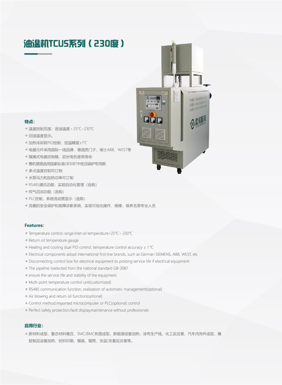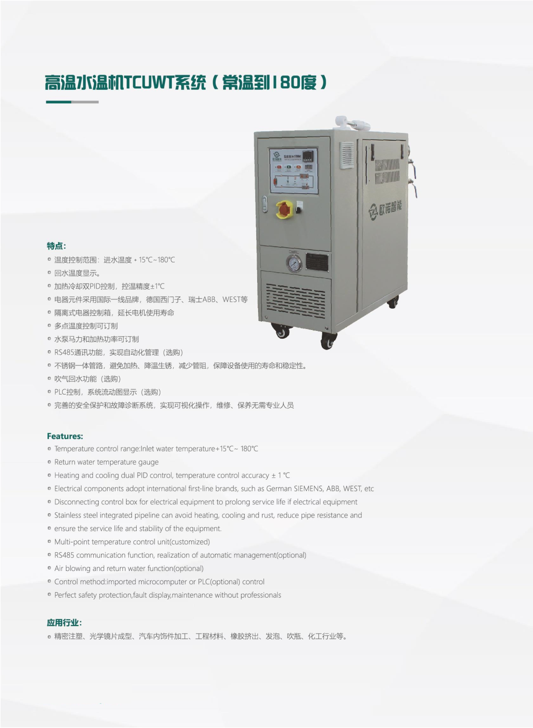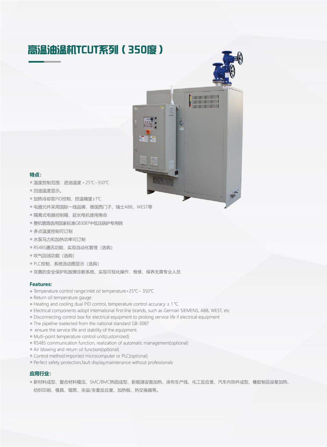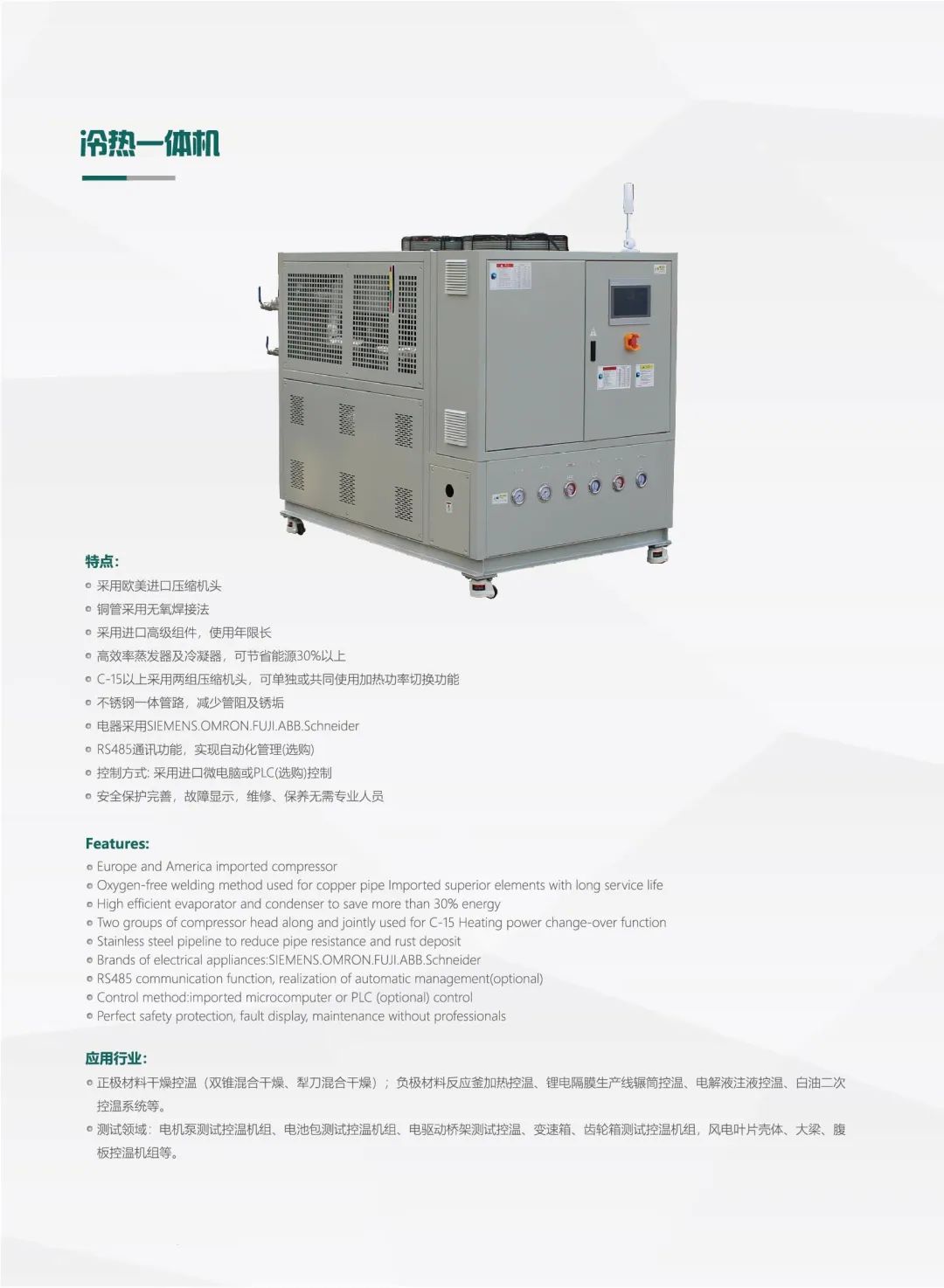 公司主要生产有模温机、油温机、水温机、冷热一体机、电加热导热油炉、工业冷水机等六大控温系列产品。同时公司为用户免费提供工艺诊断,出具控温方案,标准和非标准产品设计及生产。南京欧诺用质量说话,用服务创造市场,客户的满意是我们追求的目标!