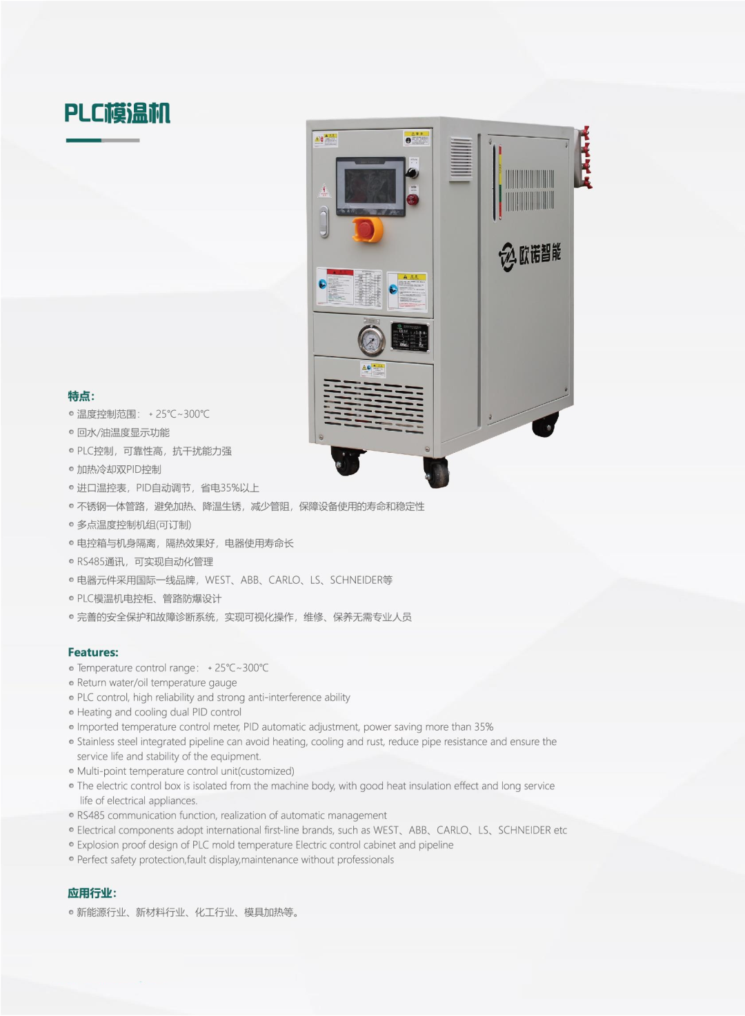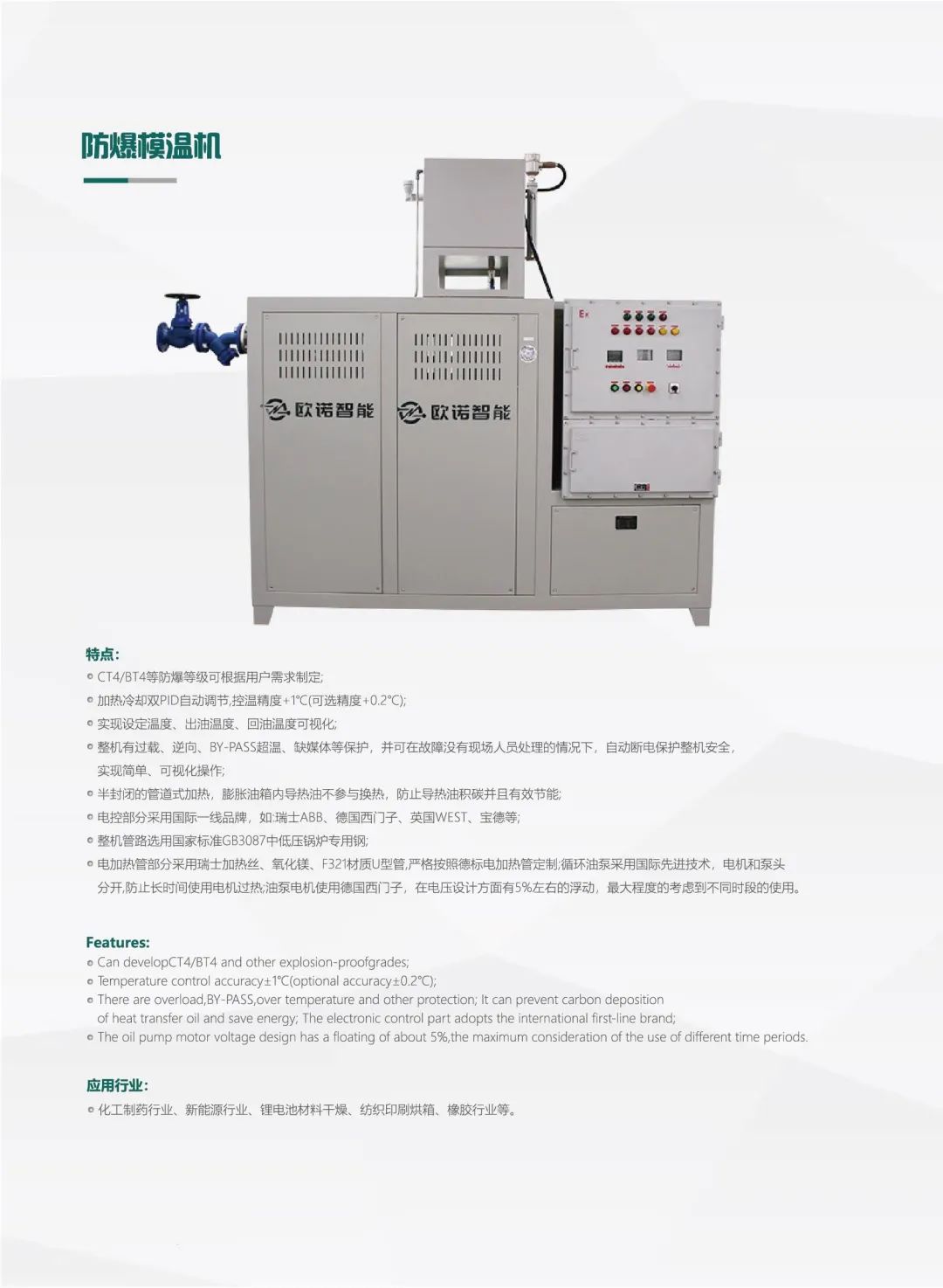 南京欧诺智能装备有限公司(ONO-INTELLIGENCE)专业从事模温机、油温机、水温机、电加热导热油炉、冷热一体机、工业冷水机等研发、生产、销售为一体的研发生产型企业,是国内一家联合国科研究院专注生产温度控制设备和提供温度系统解决方案的企业。欧诺智能凭借专业的制作经验、制作技术、优质的产品质量、诚信的经营理念,在国内外温控设备制造行业享有较高的声誉,是众多企业认可的温控设备制造商。欧诺智能严格按照ISO9001:2000质量认证体系的要求运行,始终追求先进的管理模式,不断吸收国内外温控设备制造业的先进技术,结合国内企业实际情况,不断进行温控设备技术开发和研究,并不断将研究成果应用于温控设备设计和制造。