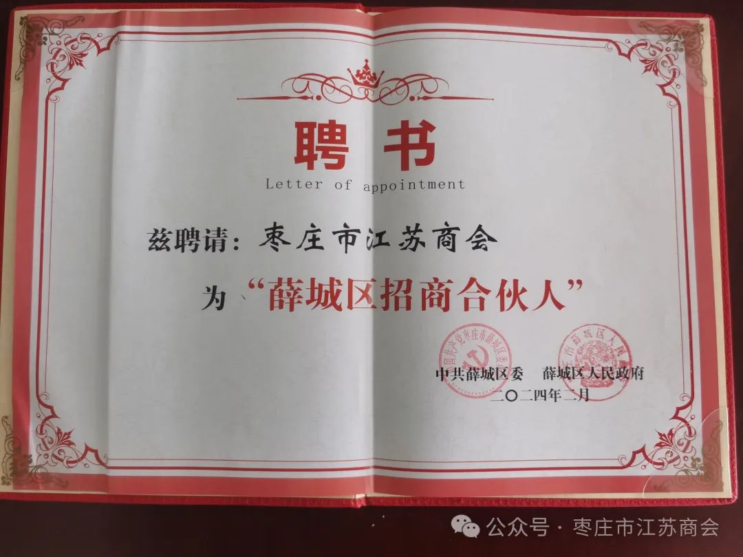 会上枣庄市江苏商会被薛城区区委区政府聘为“薛城区招商合伙人”。