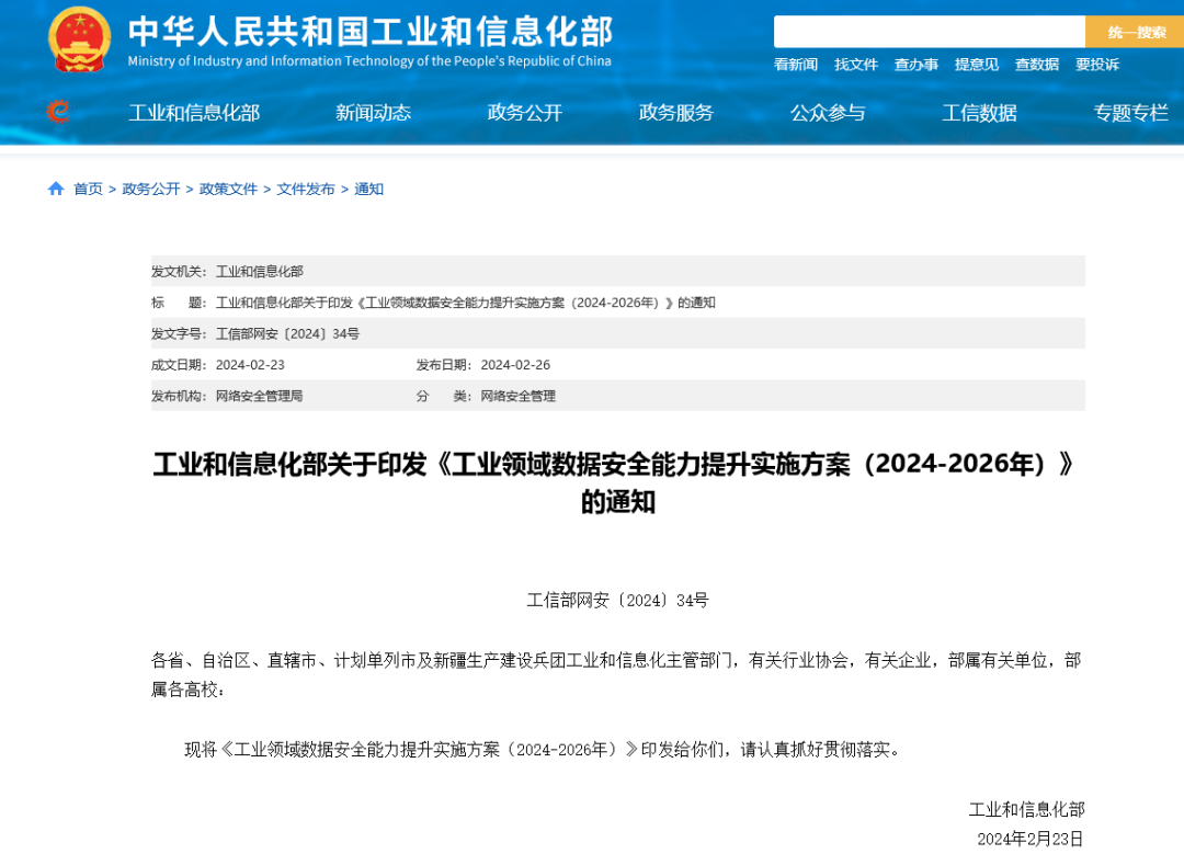 从工业和信息化部网站获悉,近日,工业和信息化部印发《工业领域数据安全能力提升实施方案(2024-2026年)》。其中提出,到2026年底,工业领域数据安全保障体系基本建立。数据安全保护意识普遍提高,重点企业数据安全主体责任落实到位,重点场景数据保护水平大幅提升,重大风险得到有效防控。数据安全政策标准、工作机制、监管队伍和技术手段更加健全。数据安全技术、产品、服务和人才等产业支撑能力稳步提升。