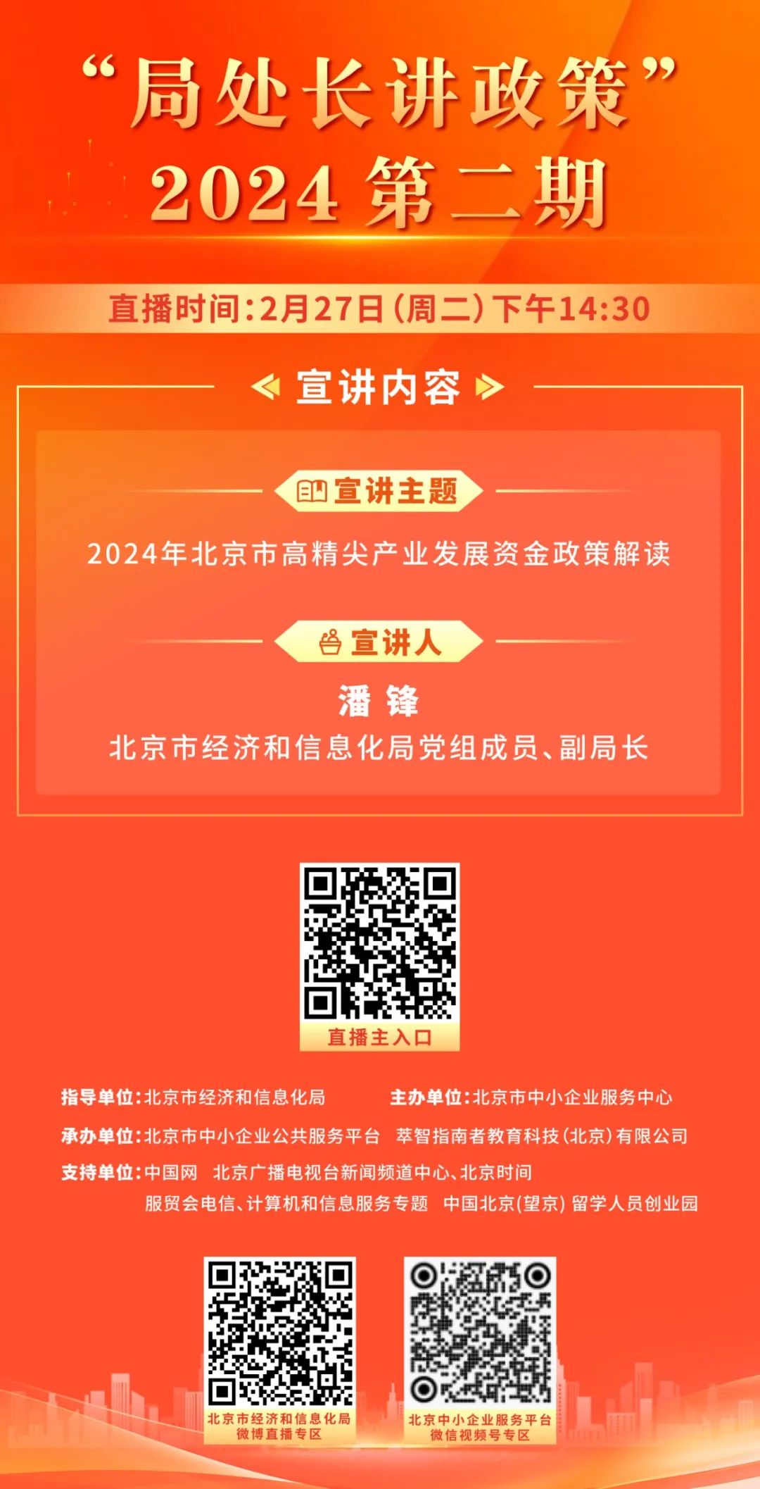 2月27日(周二)下午14:30,北京市经济和信息化局党组成员、副局长潘峰将解读2024年北京市高精尖产业发展资金政策解读。欢迎大家踊跃关注,扫描海报下方二维码观看直播。