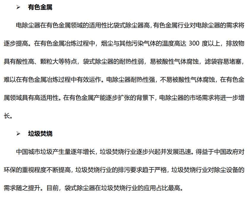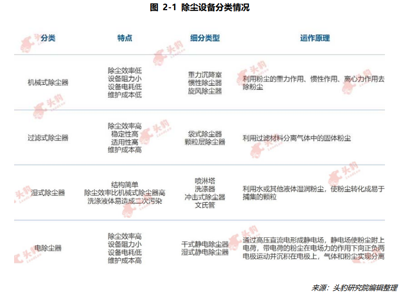 除尘设备指通过去除气体中的粉尘以实现净化工业环境的设备。除尘设备广泛应用于钢铁、水泥、电力、有色金属,机械、化工等领域,其性能主要通过除尘效率、设备阻力、设备电耗、维护成本等指标进行衡量。按运作原理的不同,除尘设备可分为机械式除尘器、过滤式除尘器、湿式除尘器、电除尘器。